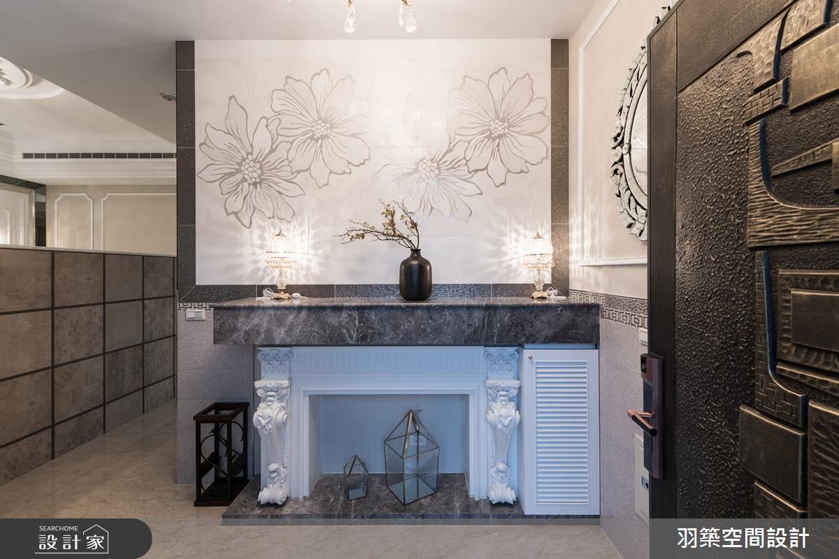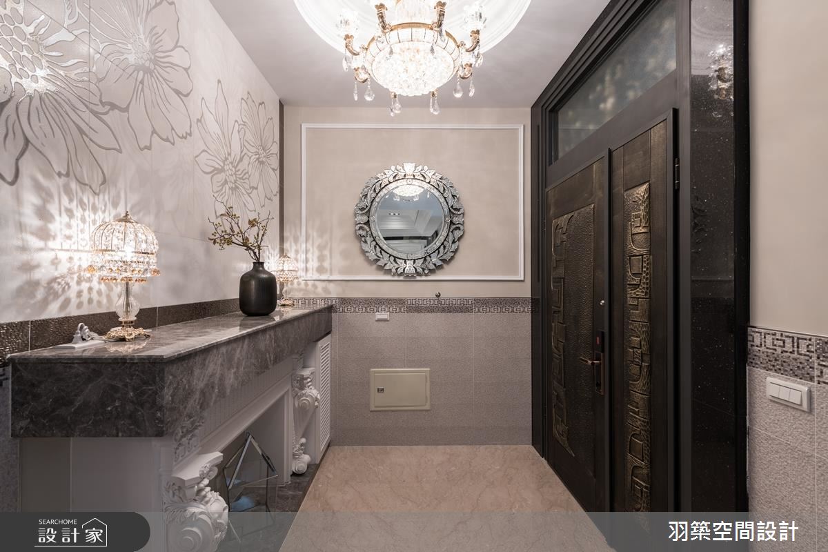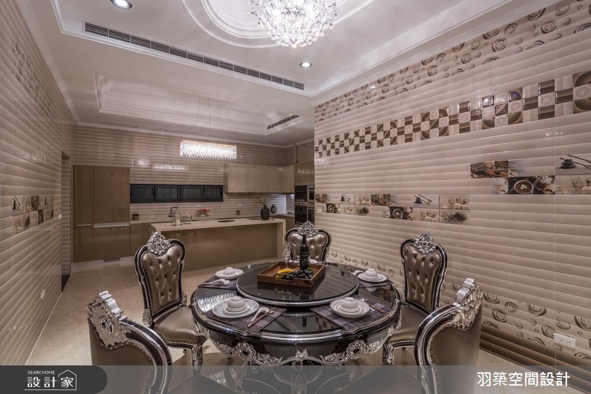 開門步入居家內,即可見到細緻的仿壁爐造型,成為第一道聚焦的美好端景,替居宅點綴氣勢,而上方則擺置一盆中式盆花,驚喜地融入雋永味道;循著動線走進客廳,可見到之於場域壁材的極致講究,並妝點細膩線板,以細節提昇精緻度,搭配鏡面、大理石等材質妝點,開展華麗的視覺饗宴;並給予向上挑高的天花,營造挑空視感,援引透亮的水晶吊燈或品味獨具的壁燈烘托,映照晶燦的光影氛圍;餐廚區,則藉由大面積磚材串聯場域,讓立面充滿濃厚的裝飾感,帶出別具特色的用餐情境,再配置古典圓形餐桌,除了形塑華麗氣氛之外,也提點出了中式圓融的團聚意義!