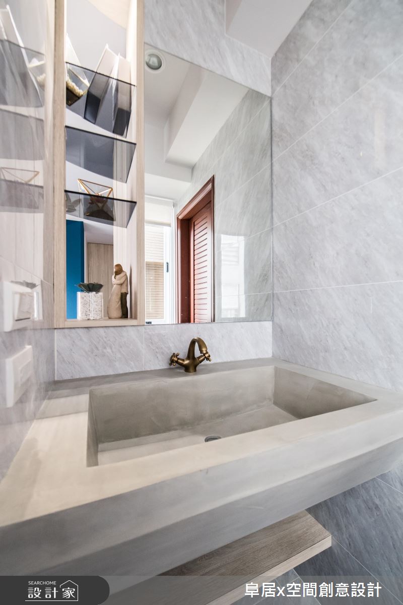 主浴洗手台獨立於浴室之外,可讓主浴內部空間更顯寬大,且加入樂土粉飾洗手檯面,並安裝穿透性的櫃體,讓人可直接望向主臥空間,串起視覺的趣味!