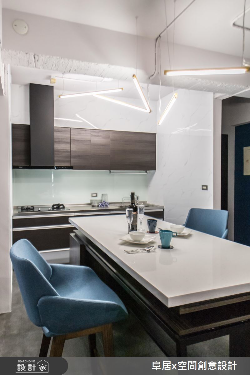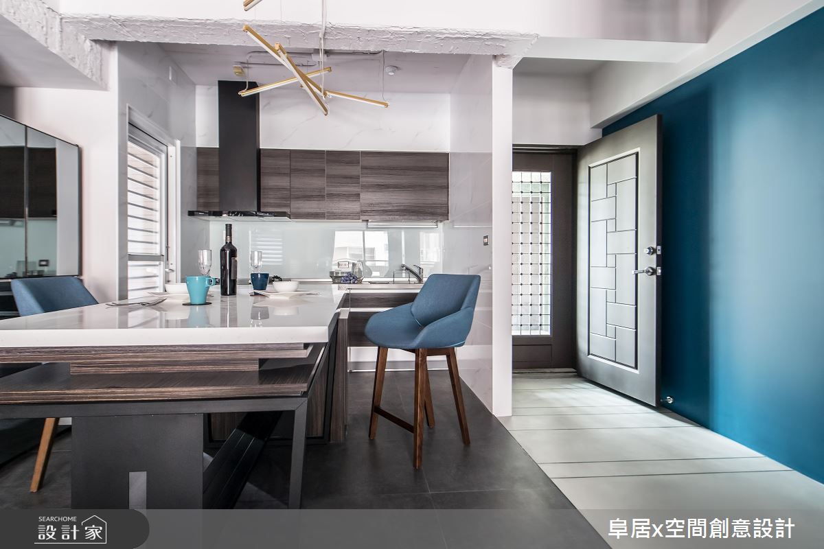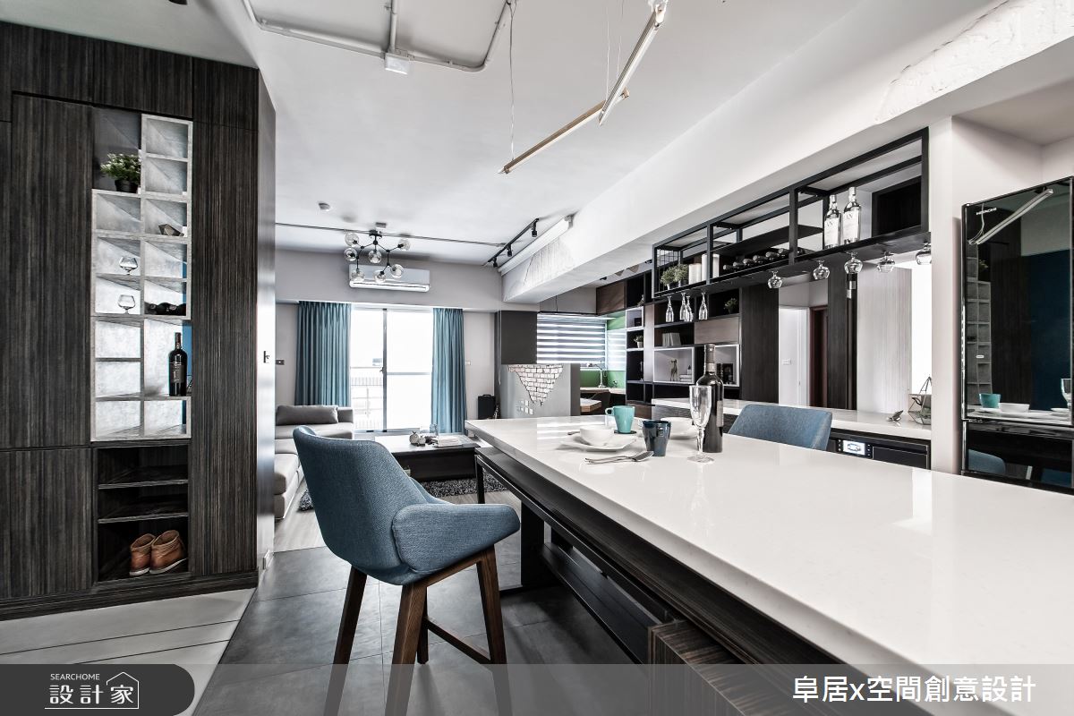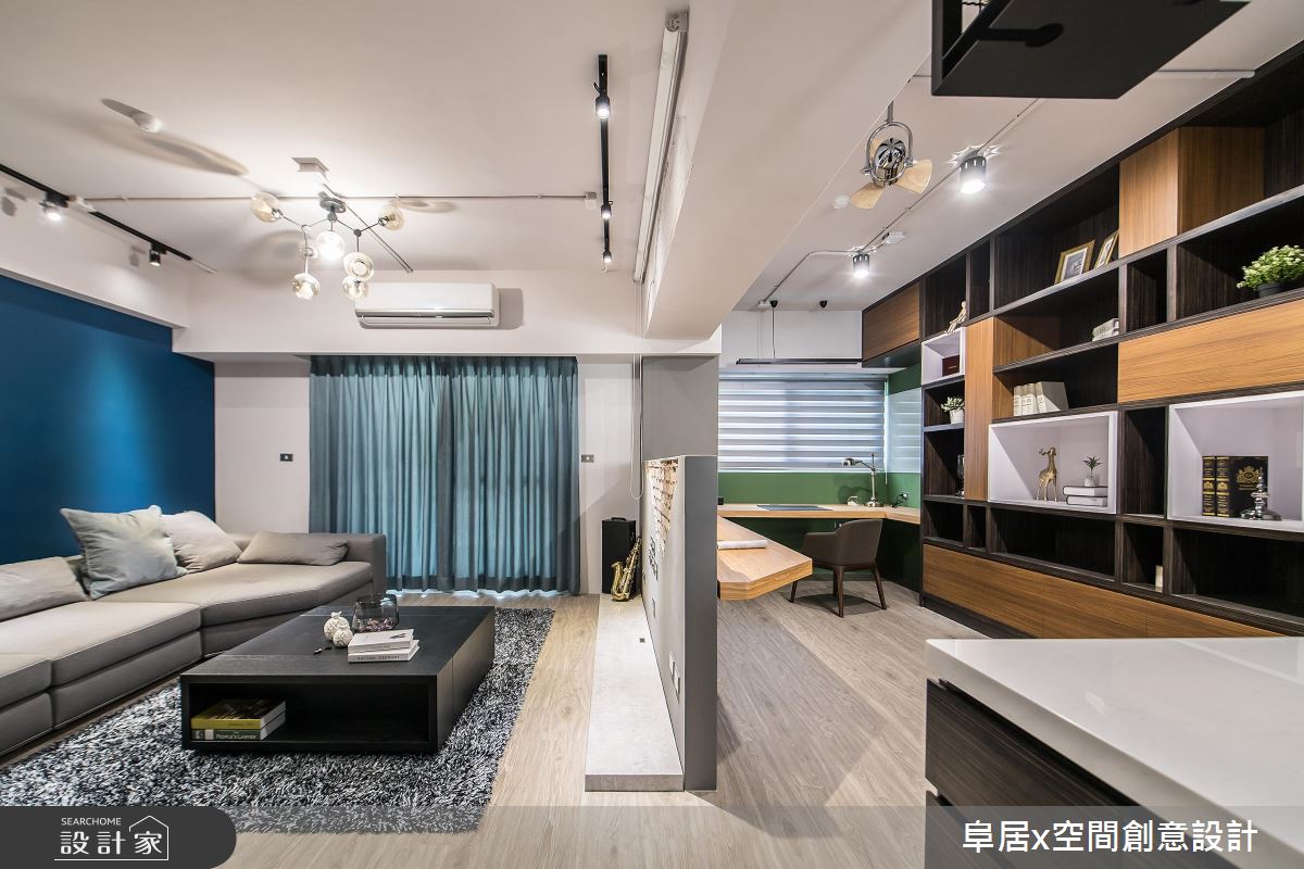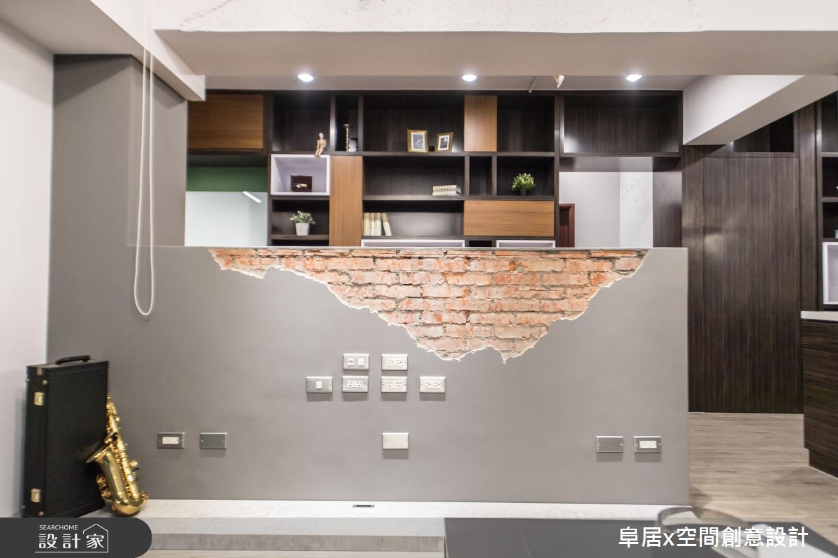 玄關地板挹注「跳格子」遊戲概念,並於鞋櫃加入「俄羅斯方塊」般的造型,除了提供展示功能,也便於變換擺設、營造生活趣味,地板更透過樂土的鋪展,加入金屬鑲飾,展現質樸而細緻的表情;客廳電視牆亦充滿新意,以水刀切割出半牆,加以鑿刀修飾,展現斑駁的視覺趣意,牆面後方則緊鄰書房,規劃活動式的掀式桌版,增添日常使用的彈性,而大面的書櫃牆,則賦予「捉迷藏」靈感,在開放或櫃門樣式的交錯之下,將門片悄悄隱於一旁,化通道口為無形;餐廳採用訂製吊燈,藉著燈的高度、方向、傾斜角度變化,營造出活潑感;主臥床頭背板刻意做出凹折角度,並加以燈具的妝點,除了達成床頭照明的功用,也營造出活潑的牆面風貌!