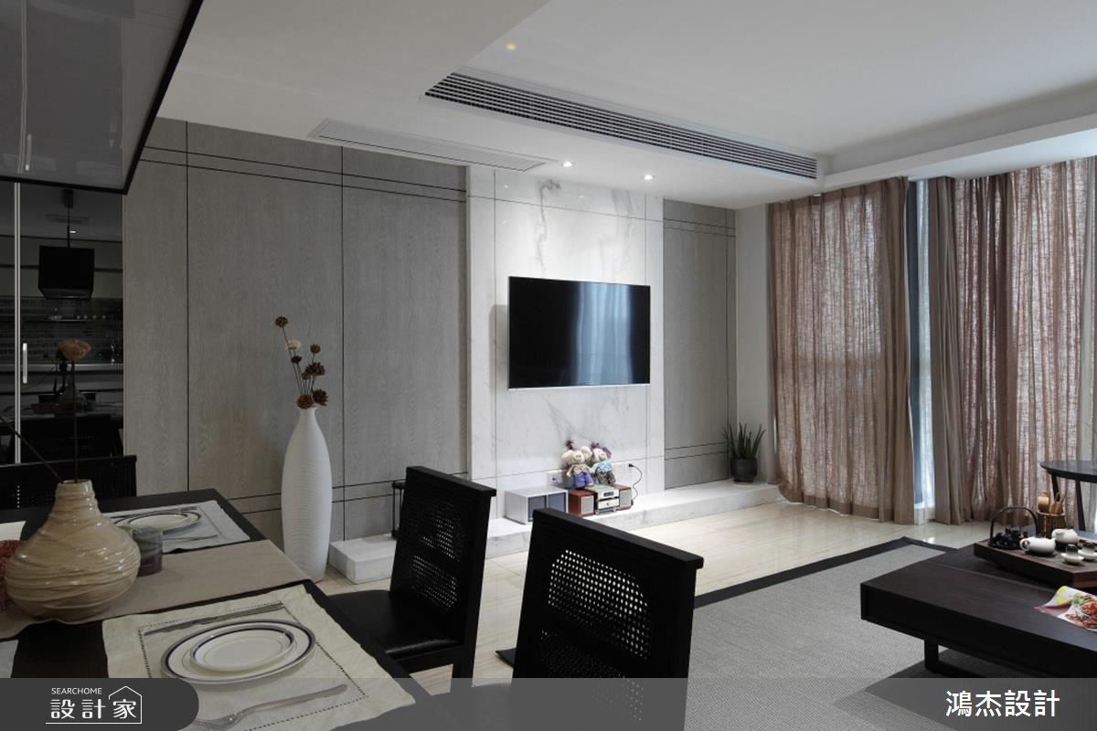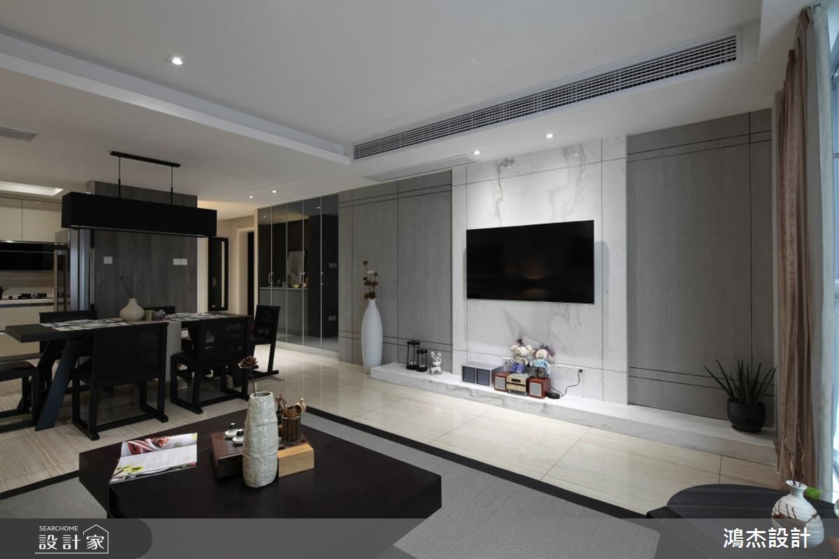 玄關接壤公領域之處,櫃體用鏡面門片開展空間的尺度,並相依著木質與大理石異材質拼接的電視牆,讓牆面有豐富的層次和變化。客廳跟餐廚空間以開放的規劃,使得動線鮮明,也賦予更多家人互動的可能。廚房則在 L 型設計下,延伸出一塊吧檯,增加空間利用的彈性。