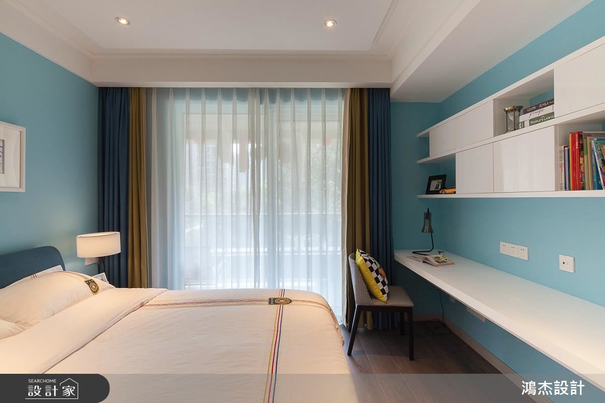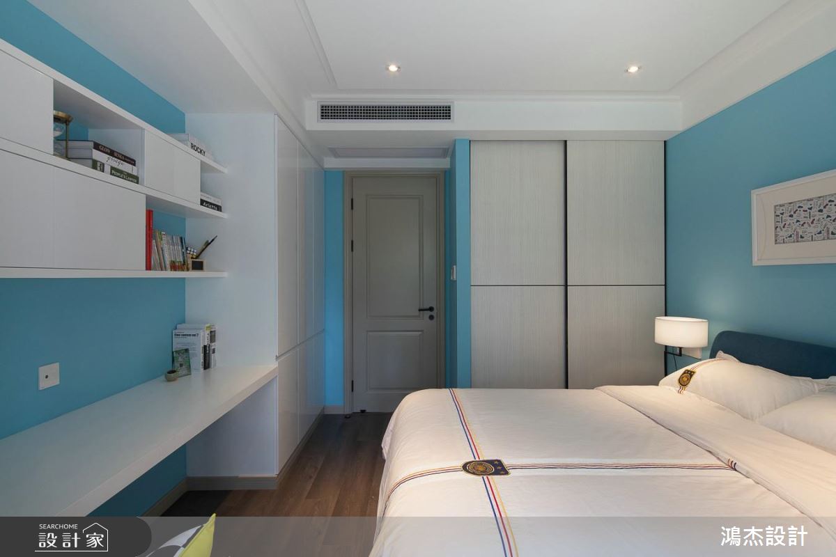 私領域各自展現家庭成員的性格:天藍牆面的臥室以白色書桌與書櫃,宛如雲朵般妝點室內,提升清新氣質;採用繃布床頭牆的臥房,在窗邊拓展辦公區域和臥榻,以及床尾一面錯落的展示牆,形成連貫的木質調性;另一間臥室則透過木紋矮櫃,塑造一區換衣空間,補足了生活機能。