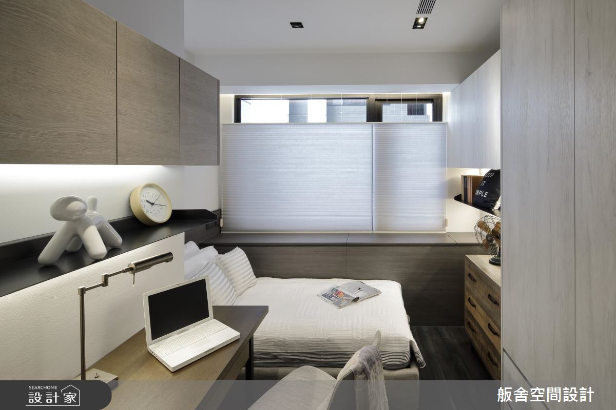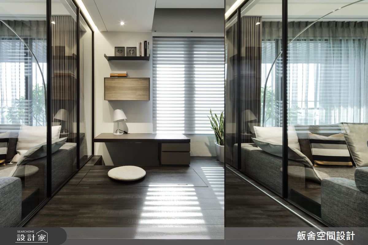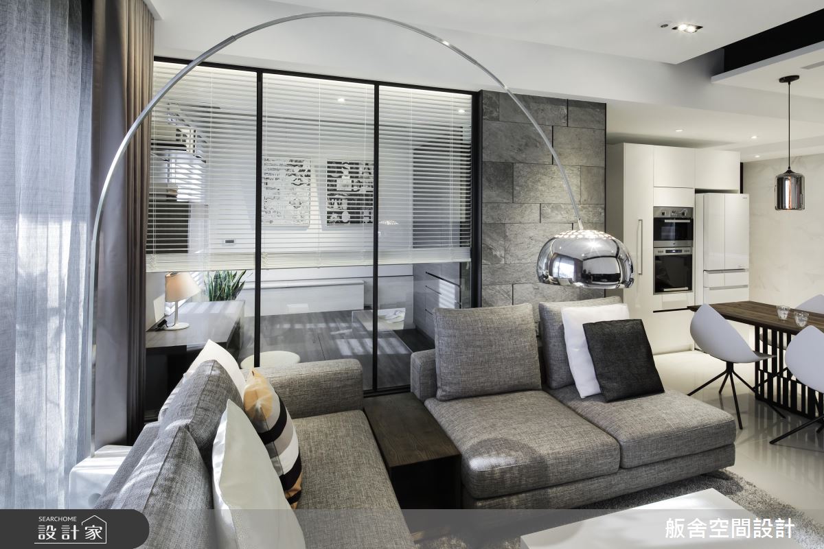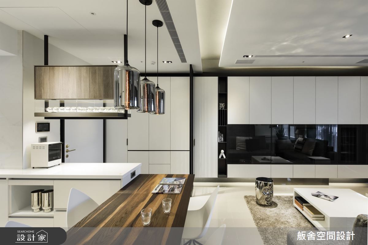 玄關處,純白收納櫃體搭佐黑色框線,作為揭開入室現代風視覺序幕,格柵屏風則阻擋一眼穿底的問題;客廳延續著玄關處的黑白設計,讓視覺得以延續,白色空間則具寬敞效果;轉向沙發背牆後方處利用鐵框玻璃隔間的半開放設計創造出一間男孩房,同時放大公領域視覺,且地坪架高的設計,作為海量收納空間,高架設計讓男孩使用書桌時,雙腳能自然垂放桌板下方;餐廚區半島吧檯緊鄰長形木質餐桌的設定,延伸用餐範圍,並利用存在感強烈的金屬燈具帶出個性表情。