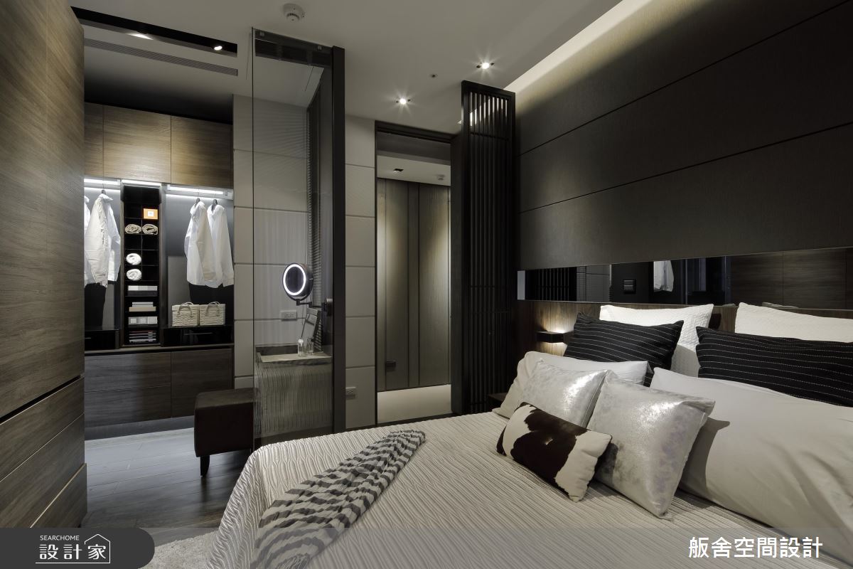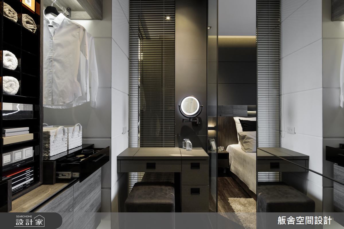 疼老婆的男屋主,希望在主臥加入更衣室、化妝區的設計,因此設計師同樣以半開放設計,分野出臥室中的不同場域,並運用精緻的彩妝收納分類、量身訂做的化妝桌,為老婆獻上時尚又實用的設計。