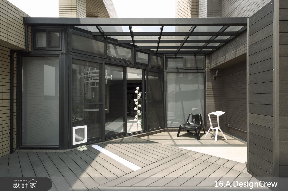 陽台在玻璃門下方規劃小小的開口,方便寵物穿梭自如,並於戶外擺放悠閒單椅,襯佐著美好日光,替一家人打造輕鬆閒適的生活場景!