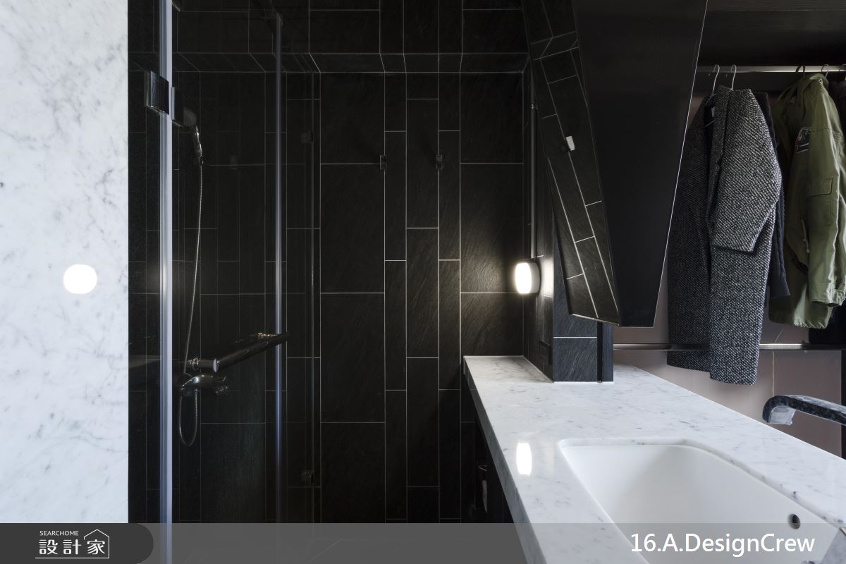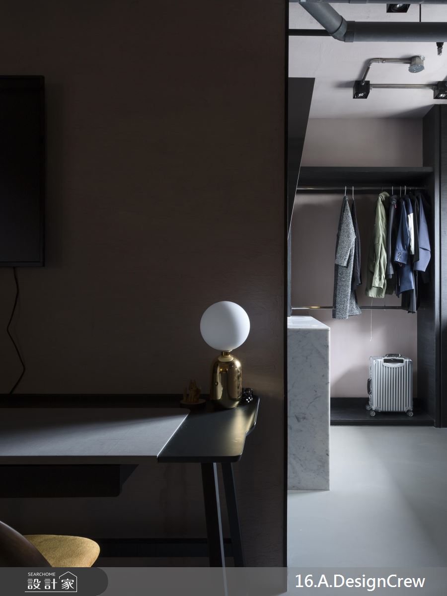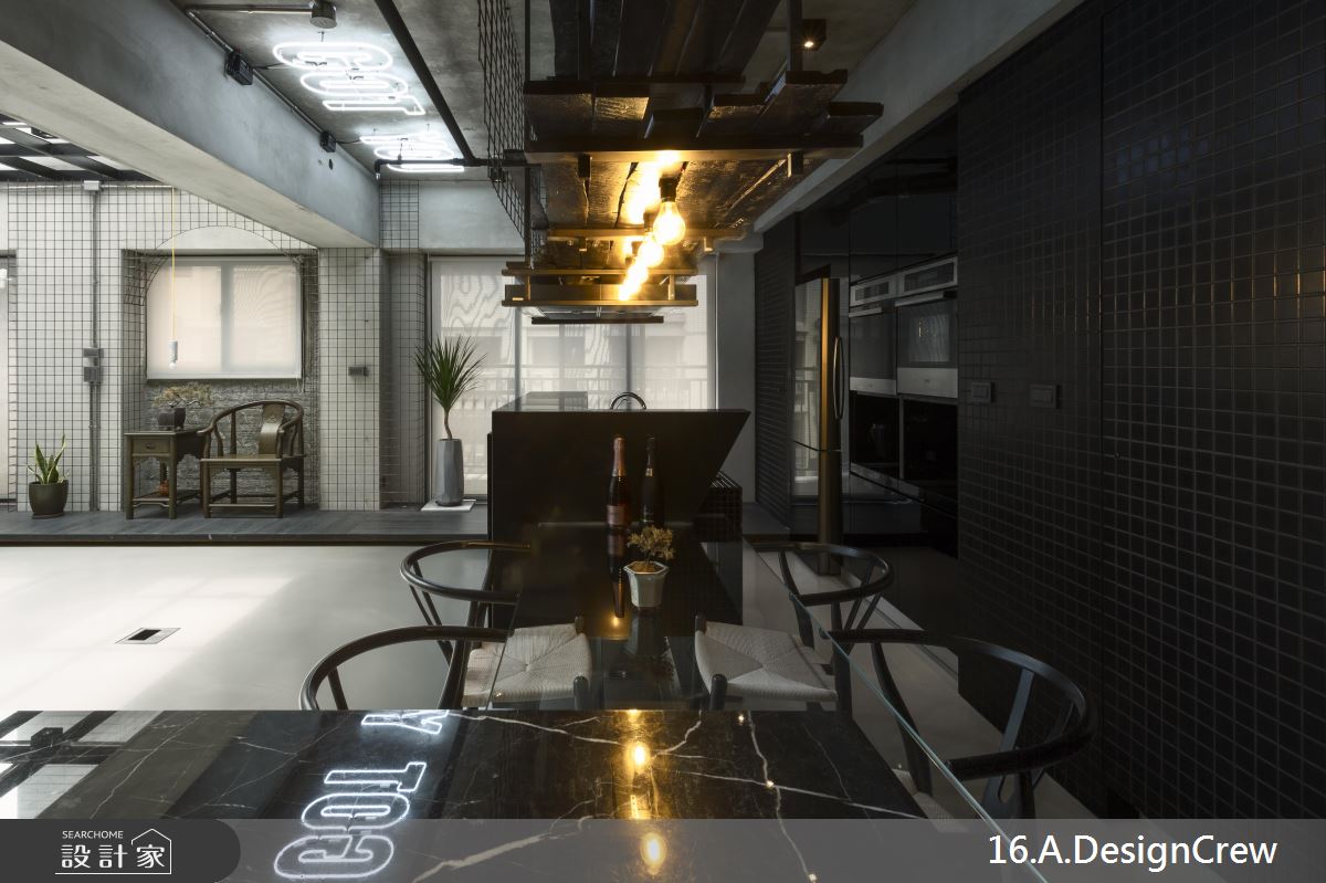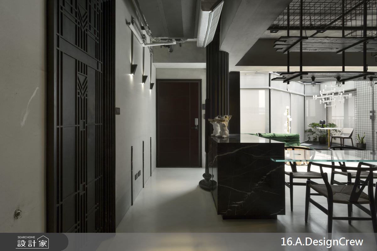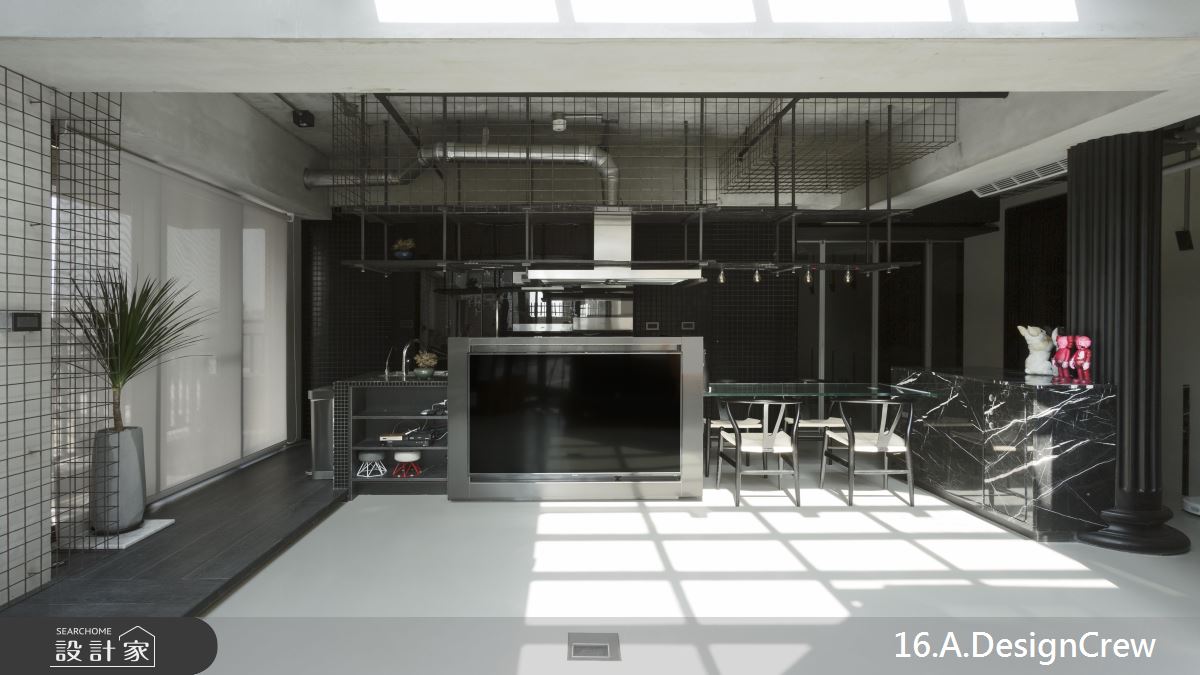 玄關區,藉由線條與燈源鋪陳、導引空間視線,並規劃大容量收納櫃,滿足鞋子的儲放需求;廳區,因應斜向不規則格局,打破制式的區塊劃界,讓客廳兼具接待、休憩、收納與閱讀等功能, 並沿牆鋪設架高木地坪,讓居家角落可隨處坐臥、悠閒自得,同時讓天花作為一大亮點,採以玻璃建構格窗,引入充沛採光,且延展向上的空間感;廚房領域,則與客廳共享同一道牆面,整合電視機與料理壁面的雙向功能,創造更多使用可能,再於餐區加入鐵格網、馬賽克磚等深色建材,並搭接照明烘托,營造工業風的鮮明個性;主臥內,完善分配主浴、更衣間位置,開創有限坪數的複合效益,佐以重點式的光源輔佐,兼具舒適性與好氣氛!