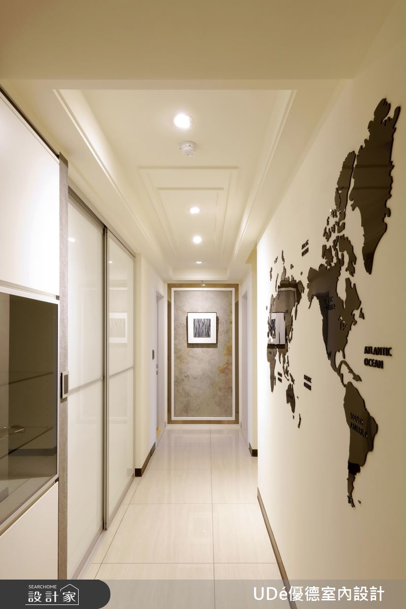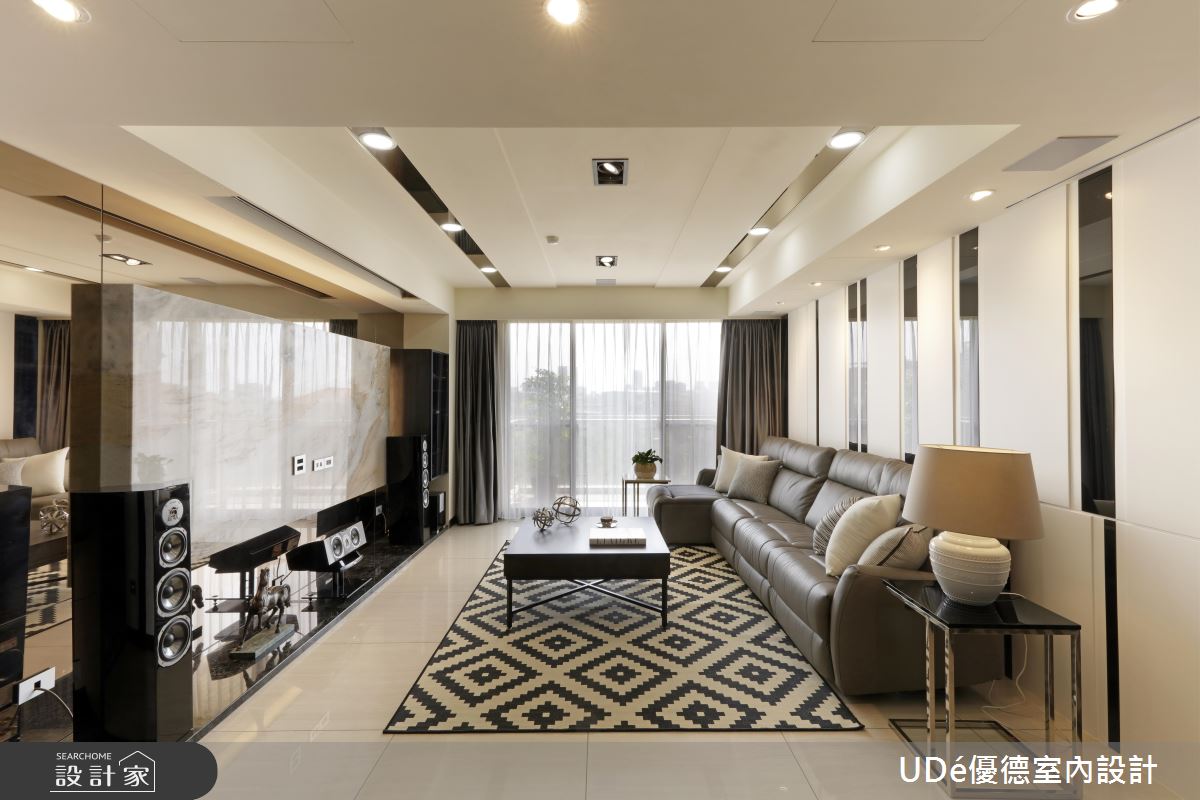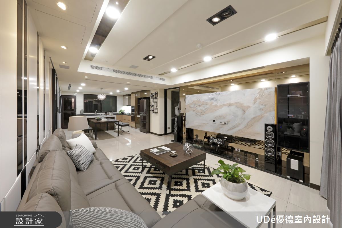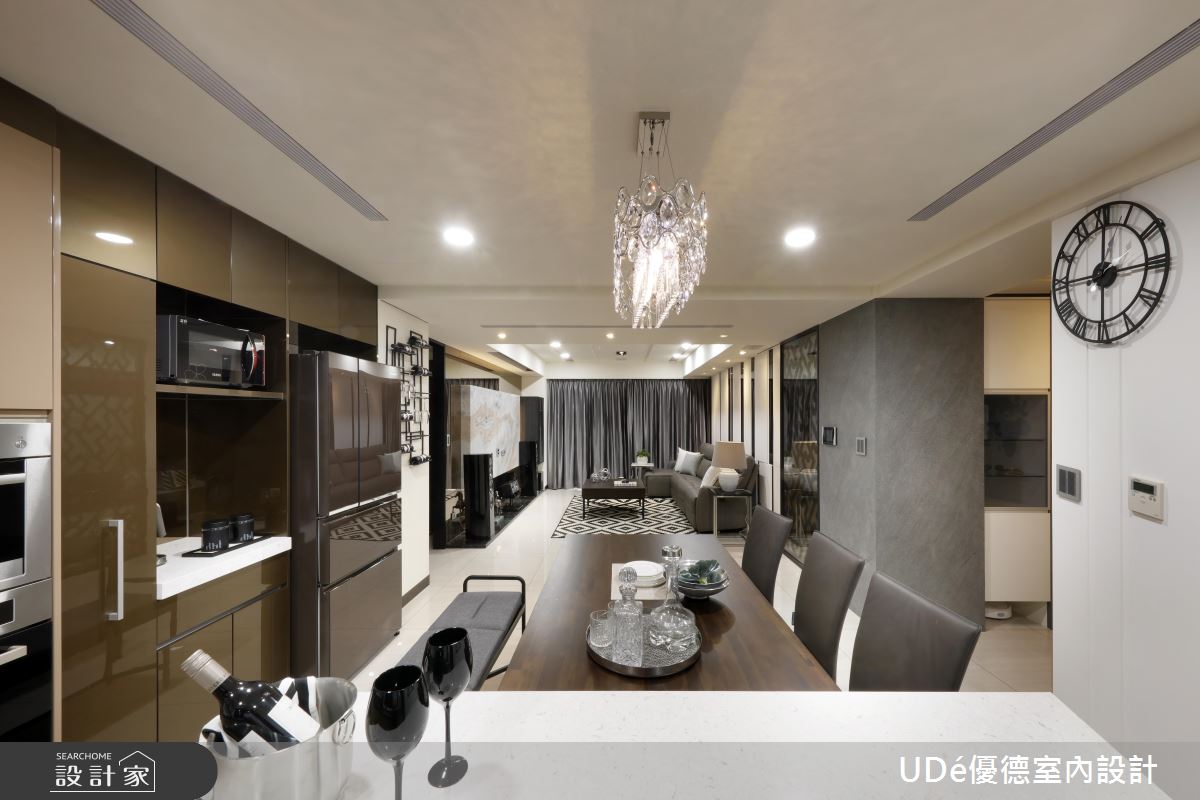 設計師於電視牆、沙發牆分別加入反射性鏡面素材,輔以光源的照映烘托,使光感可反射到居家各角落,讓情境光源及窗外採光相得益彰,映出整個宅邸的敞亮氣度;地坪規劃上,則藉著地磚與地毯的鋪陳,與整體黑白配色相呼應,適時揉入活潑的幾何圖騰,為空間帶來矚目焦點,注入優雅的時髦風格;餐廚場域,也於餐桌上方安置水晶吊燈,在璀璨光影中襯出美好品味,延伸至廊道,則可見牆面訂製的世界地圖裝飾,在客製化的設計中,記錄屋主旅行的甜蜜足跡;臥房,透過電視牆的牆面界定,巧妙劃出一小塊書房領域,在房內區分出梳妝、閱讀、休憩等完整主題,機能性十足!