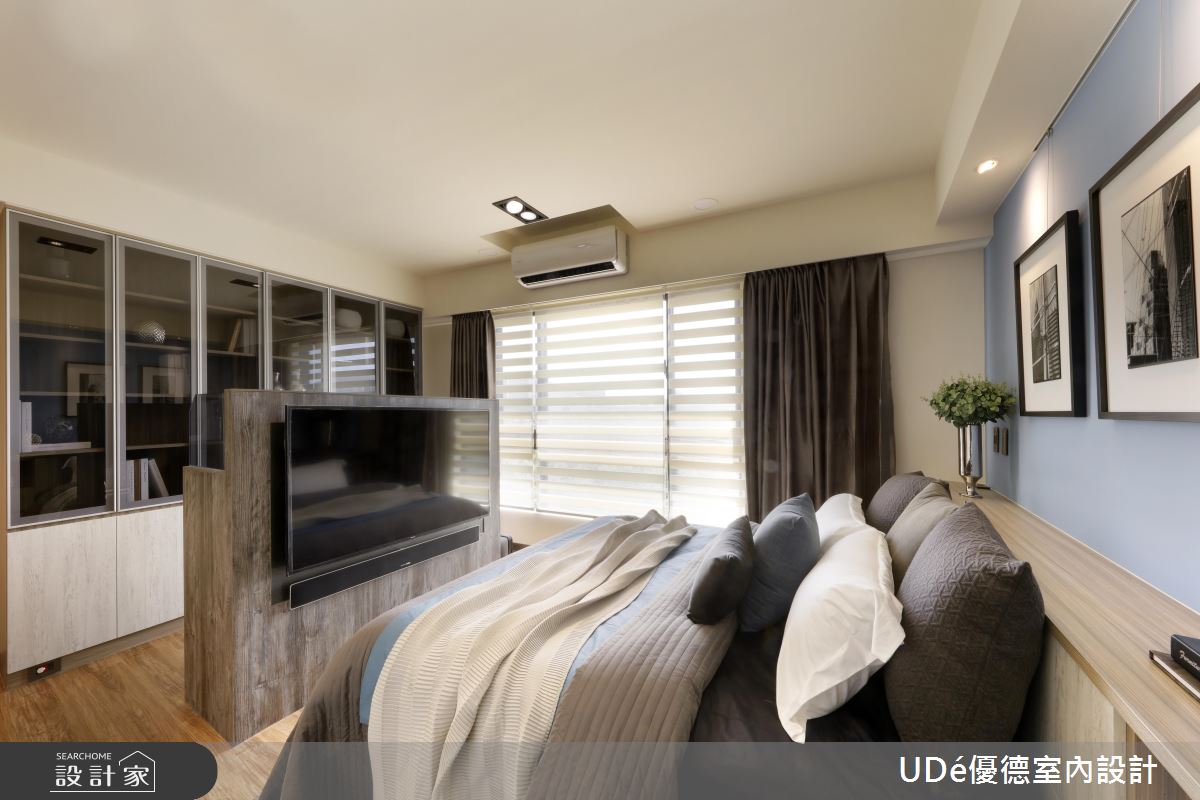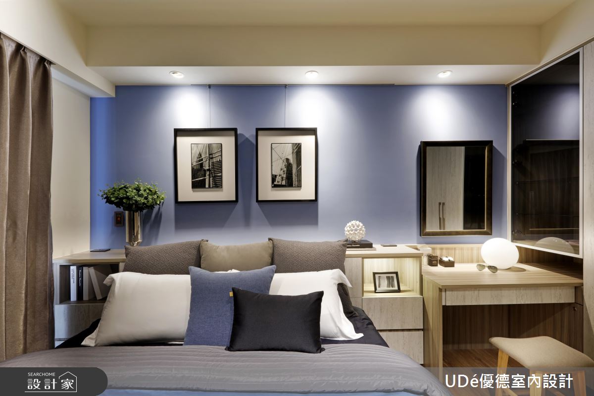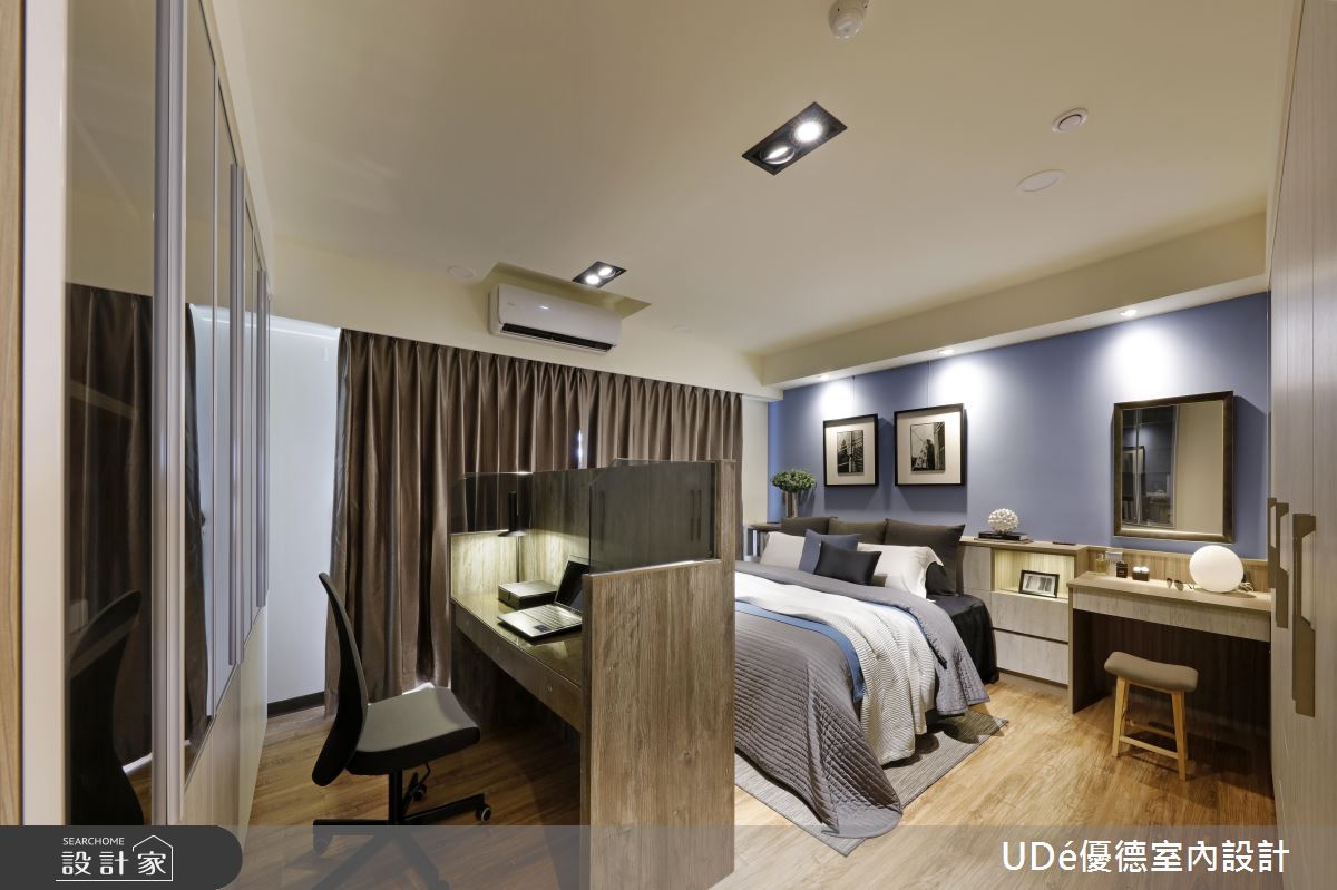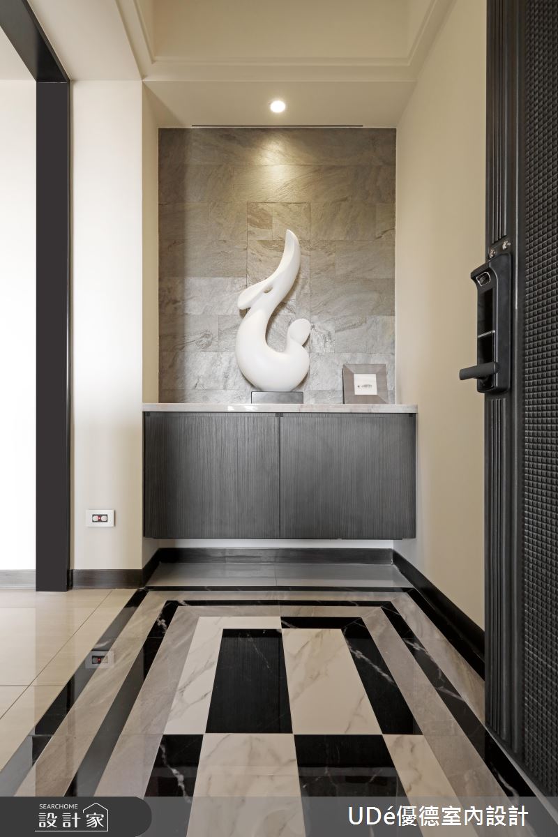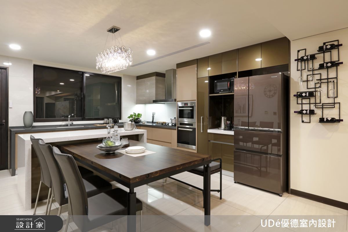 設計師於電視牆、沙發牆分別加入反射性鏡面素材,輔以光源的照映烘托,使光感可反射到居家各角落,讓情境光源及窗外採光相得益彰,映出整個宅邸的敞亮氣度;地坪規劃上,則藉著地磚與地毯的鋪陳,與整體黑白配色相呼應,適時揉入活潑的幾何圖騰,為空間帶來矚目焦點,注入優雅的時髦風格;餐廚場域,也於餐桌上方安置水晶吊燈,在璀璨光影中襯出美好品味,延伸至廊道,則可見牆面訂製的世界地圖裝飾,在客製化的設計中,記錄屋主旅行的甜蜜足跡;臥房,透過電視牆的牆面界定,巧妙劃出一小塊書房領域,在房內區分出梳妝、閱讀、休憩等完整主題,機能性十足!