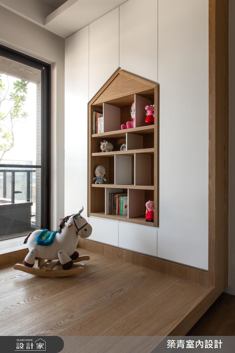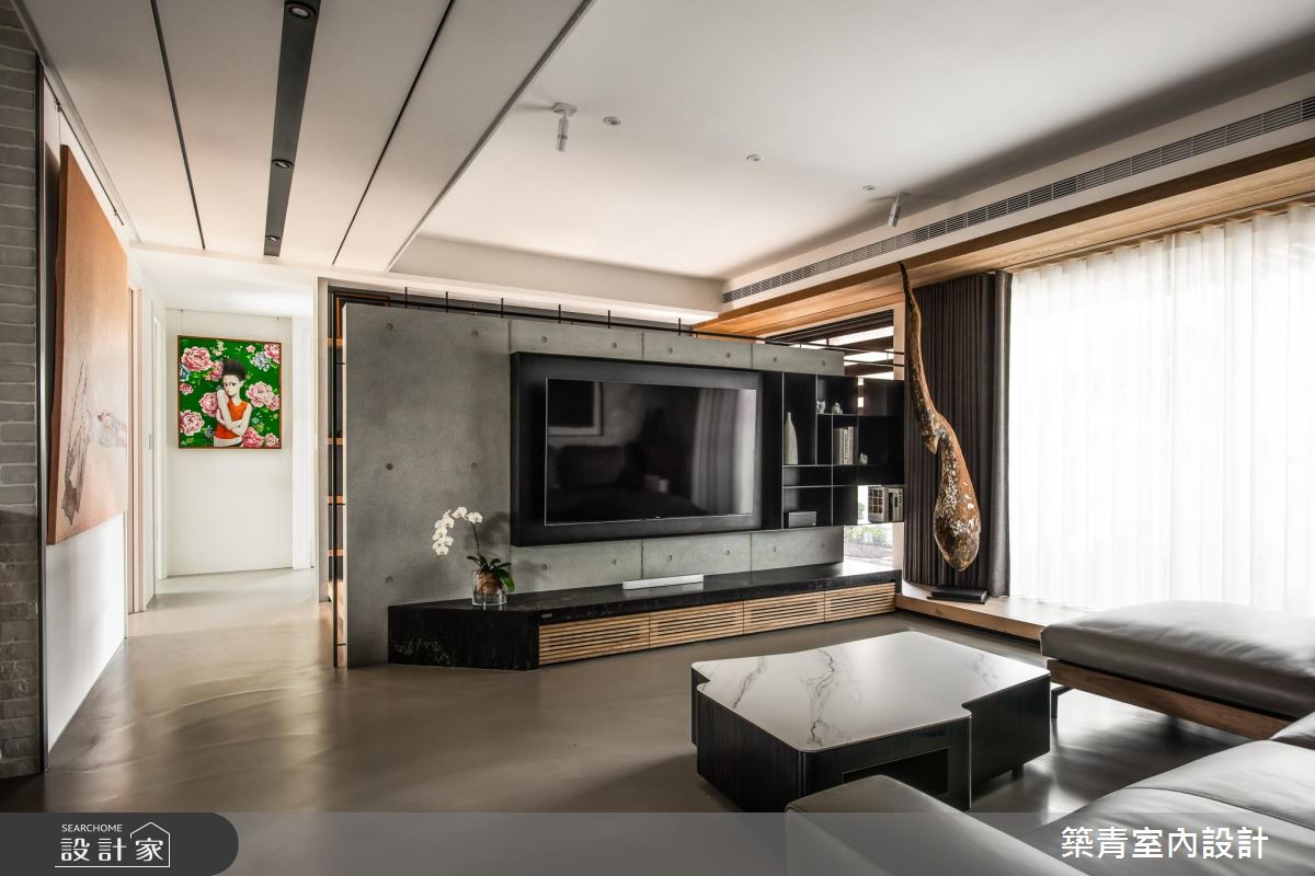 玄關區以斜牆的設定,梳理原屋況過度曲折的動線,同時為空間保留了隱私性,而斜牆的大面積空間,也成為了大幅掛畫的最佳展示位置。公共區域地坪以特選的灰質鋼石,覆蓋拋光磚地板的生冷,展現質樸、沉穩氣場,而天花處一道黑白條紋大樑,作為視覺、生活動線的分水嶺,劃出場域界線。客廳電視牆鐵件收納,以特殊的的延伸設計,讓櫃體與牆面的鏤空處,為客廳帶來充足採光,搭佐一旁大型雕塑逸品,讓家裡的每個場域都能受到藝術陶冶;私領域臥房則以灰、藍色系鋪排,延續公領域的空間氣質,而小孩房則以粉色世界地圖,帶出視覺重點,並在收納櫃上以房子造型框格,點綴活潑情景。