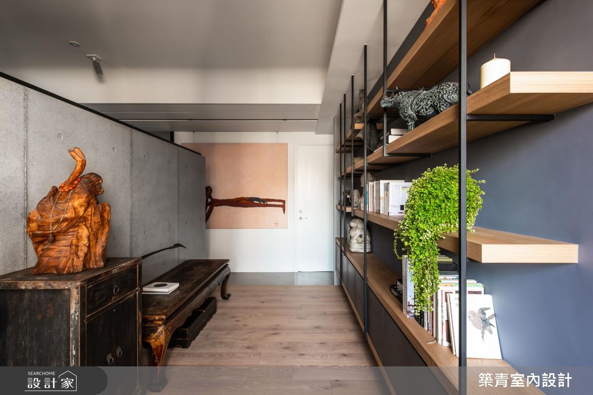 客廳後方客房被拆除後,運用電視牆輕巧區隔開放書房,作為讀書、辦公及休憩的開放空間,展示鐵件的書牆設定,不僅滿足收納需求,同時也是小型藝術品的展示間。