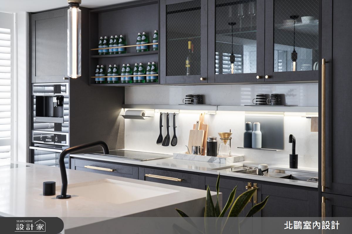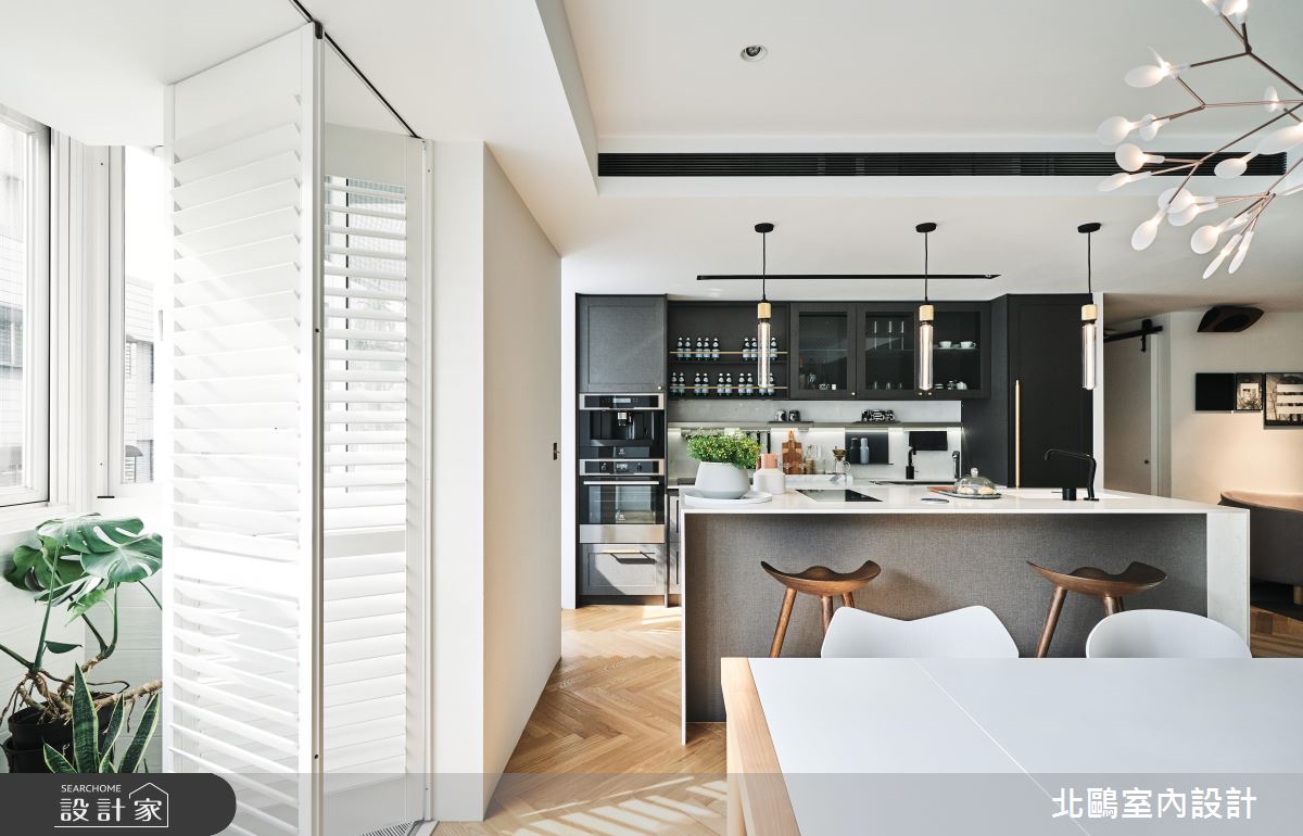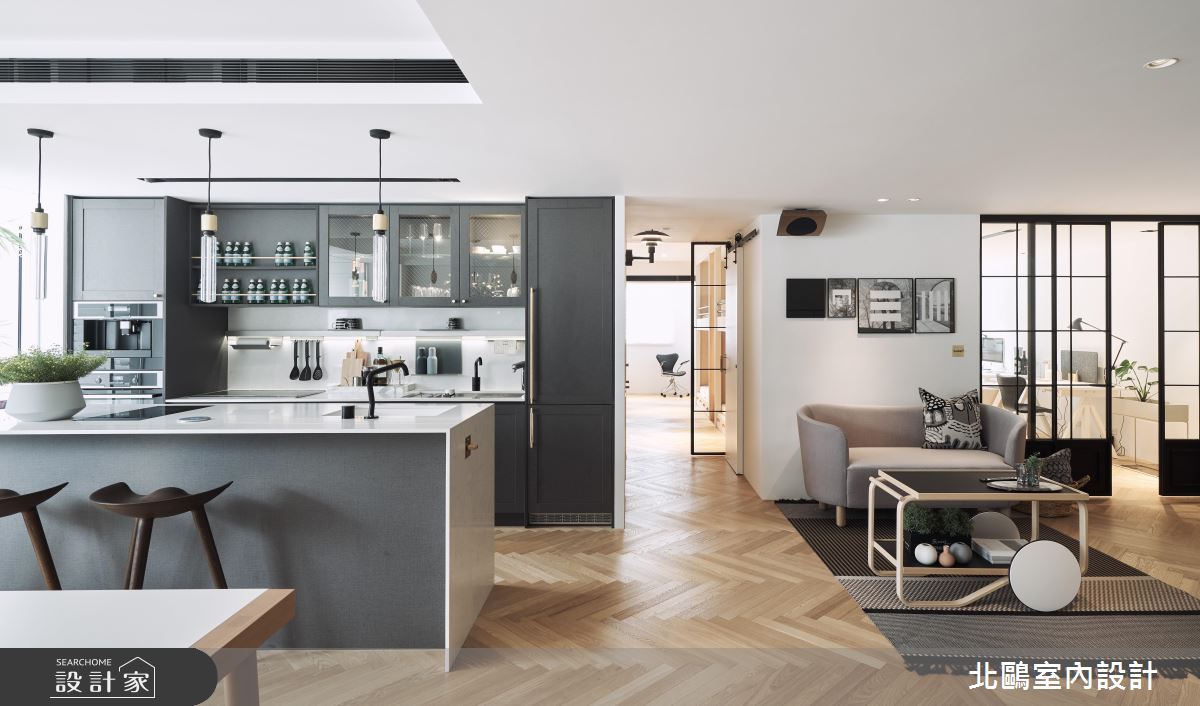 玄關區域,於廊道加入白色復古磁磚拼貼,鋪敘出漫活的悠然步調;並給予開放式的公領域設定,讓客、餐、廚保留大幅度的互動關係,而針對採光問題,則將前景觀陽台外推、引自然光入內,形塑敞亮的空間感;客廳區,則使用淺色家具搭襯溫煦木地板,表現紓壓的北歐生活態度;同時依循屋主需求,規劃一間工作室,採用鐵件結合玻璃製做拉門,營造視覺通透感,內部則陳列綠色植栽妝點,柔化嚴謹的工作氛圍!