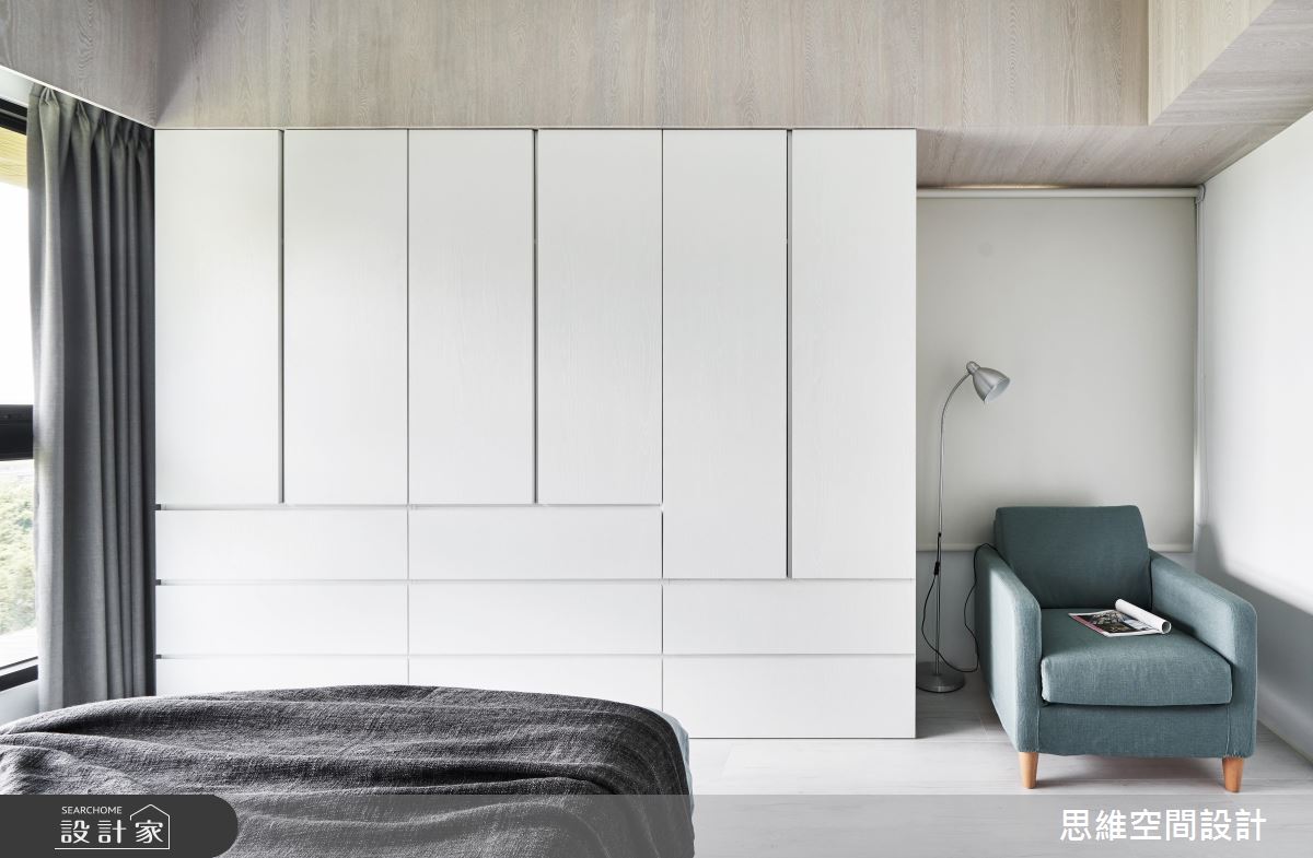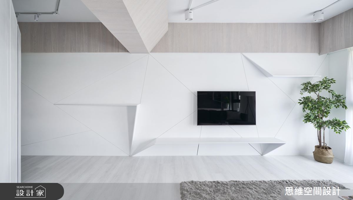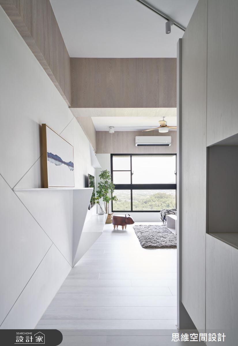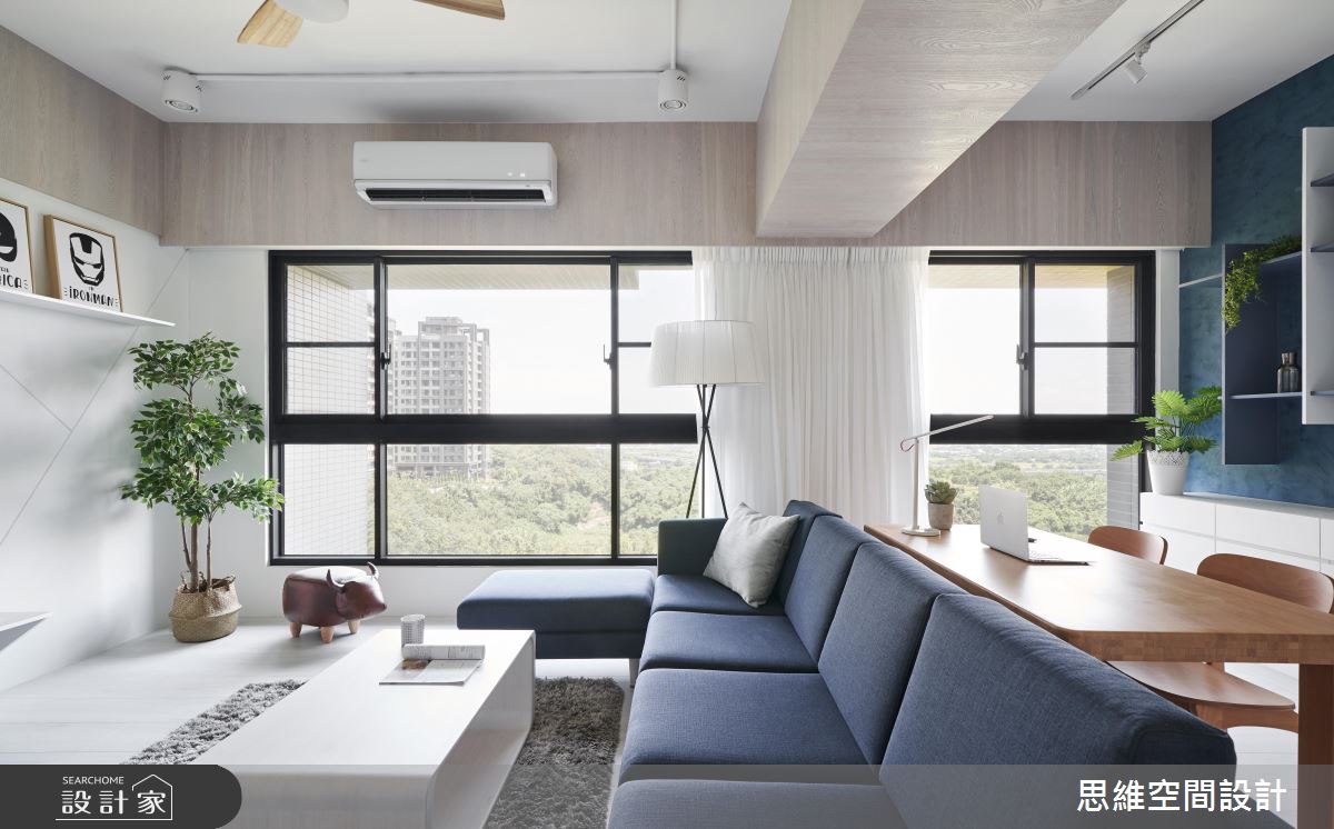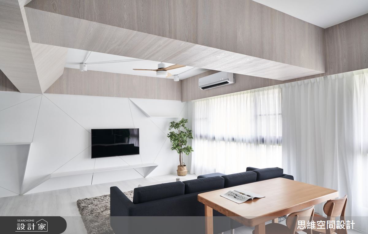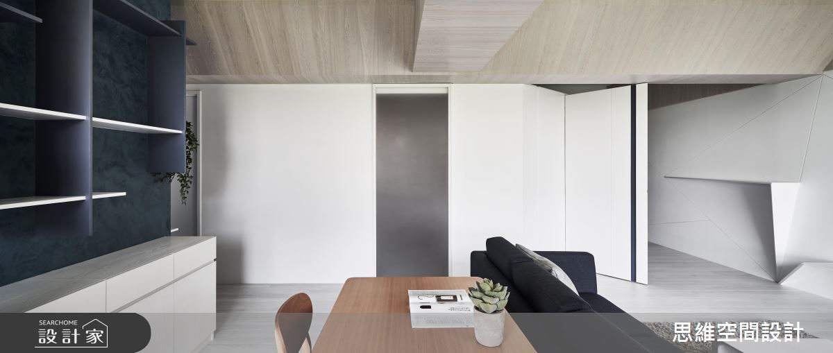 從玄關開始以白色視線展開,一路延伸到客廳的窗戶,視野延伸戶外開闊的景緻,隨即心曠神怡。電視牆以大面積的白色調鋪陳,斜切線條勾勒平台、展示機能以及溝縫造型,宛如摺紙藝術般傳遞出生動的視覺感受;公共空間中的十字樑結構又深又大,為了凸顯其空間核心地位,將天花板之外的大樑以及窗簾盒以木皮包覆,巧妙化作造型之一,自然凸顯存在感;沙發後方為開放書房區,壁面漆上藍色調的特殊塗料,營造出迷人的視覺焦點,伴隨線條感的層板設計,勾勒出輕盈、靈活的展示機能,搭佐風格物件與綠意植栽的安排,挹注人文藝術氣息。