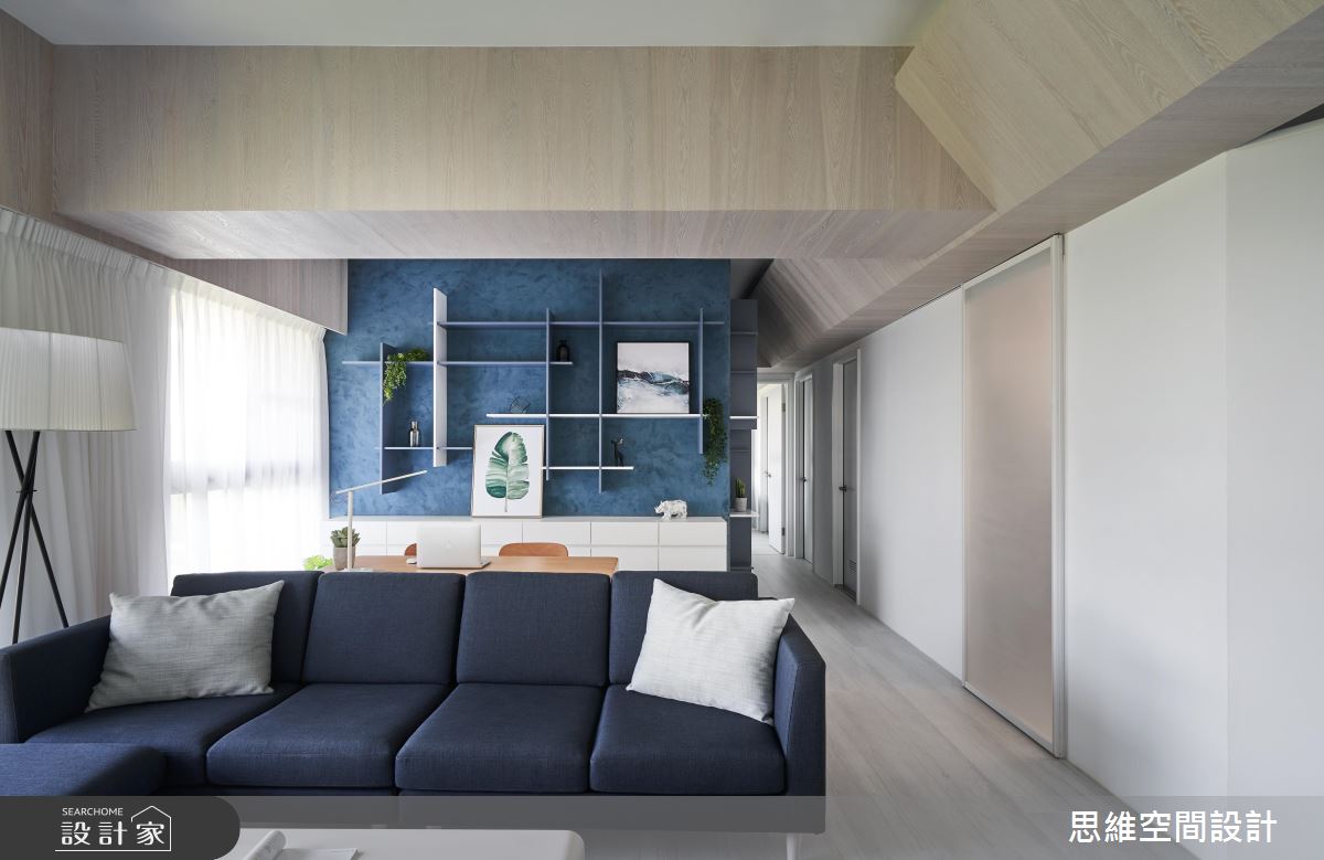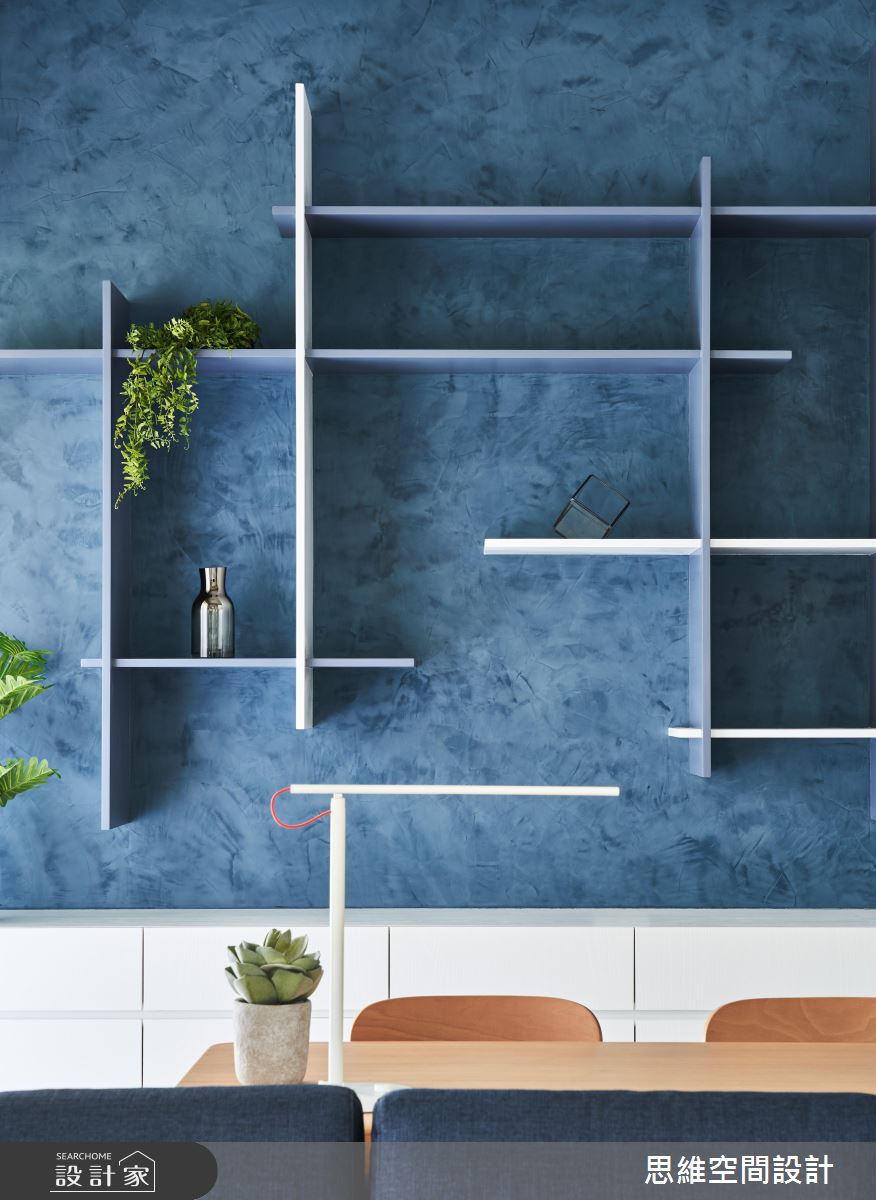 整體空間以大量的白色調為基底,藉由溫暖的木紋注入居家溫度,以藍色調美學展示的牆面,烘托視覺焦點,簡約之中又彰顯豐富、層次感的設計,讓屋主品味生活的一切美好。