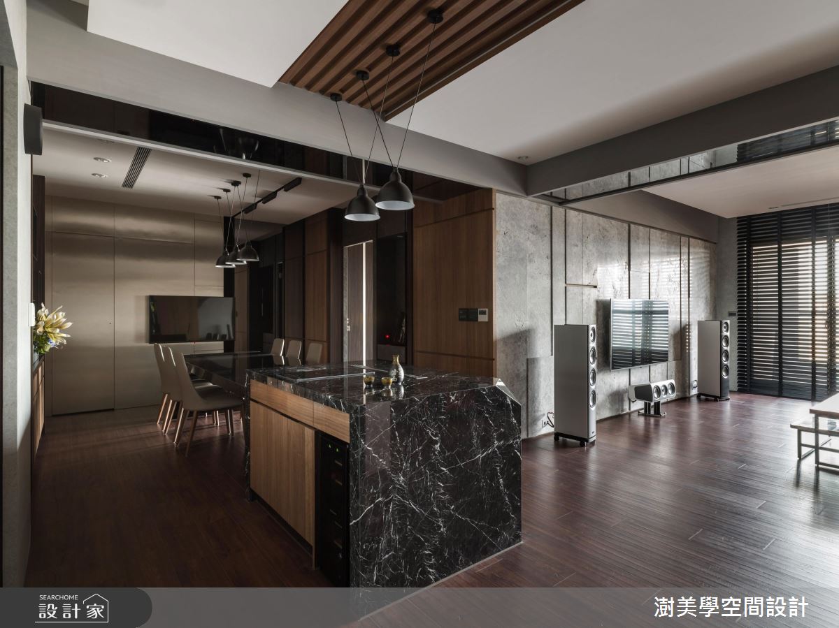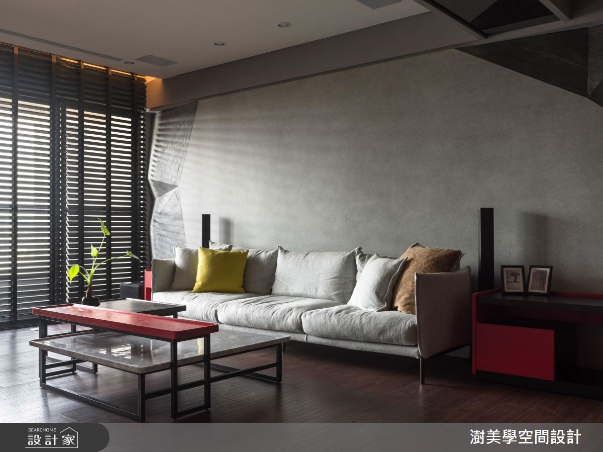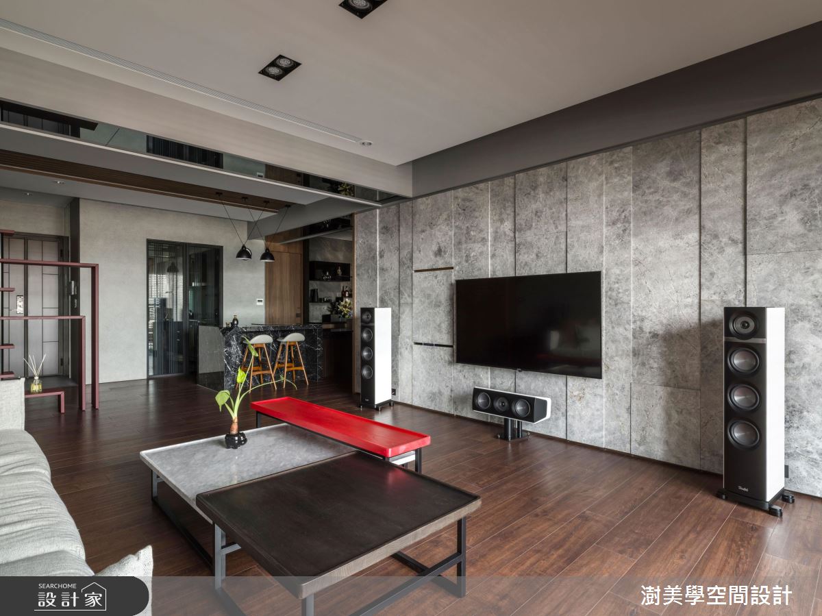 玄關區域規劃紅色精選旋轉展示架,兼具場域界定作用,可調整角度,營造多變的展示情境;客廳,則選用細緻復古的暮光大理石打造電視牆,加入精密切割及凹凸貼工,形成大器的主題畫面,沙發牆則刷上仿清水模塗料,彰顯質樸表情,搭配紅色桌几點綴,跳出摩登色彩亮點;全室收納,大半採用現場製作的木工櫃,彰顯自然質感,並美化居家的收納形式,運用材質拼貼,讓每一道櫃面都是美輪美奐的展示表情;餐廳區,讓餐桌銜接吧檯形成中島,兼具用餐、交誼等功用,並以餐吊燈串起聯繫、使視野延續不間斷,締造開敞、通透而流暢的生活場景;加大的主臥,除了增設專屬更衣間,也在床頭鋪陳黑檀木格柵,將收納與門片隱於其中,再加入灰鏡妝點,帶出延伸感!