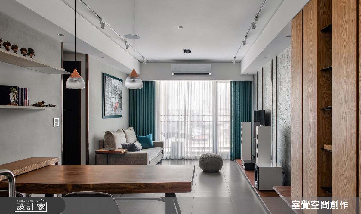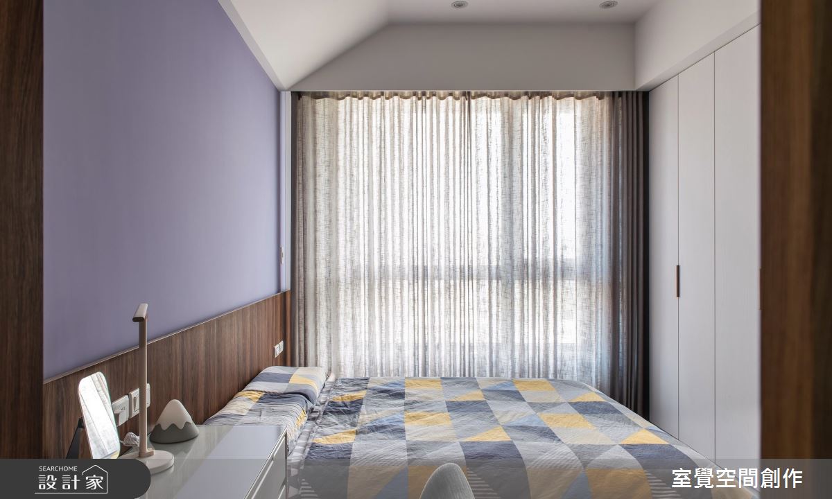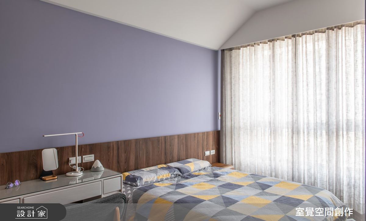 入口,規劃大容量的櫃體卻串聯電視牆,並做出懸吊與透空造型設計,增添量體的輕盈感,電視牆則透過石材鋪展視覺張力,並加以金屬飾條作出比例勻稱的線性分割、增添畫龍點睛作用,呈現出粗獷和精緻的對比感,低調又顯設計感;並在沙發牆、餐廚領域鋪陳具質樸手感的灰色漆料,豐富空間層次感,餐廚之間則呈開放規畫,讓餐桌與餐櫃一體成型設計,於有限空間締造最大使用坪效;臥房內,考量到床頭上方的橫亙樑柱,選擇利用斜面造型化解突兀,讓天花更具造型感,搭配繽紛亮麗的色彩主調,點出舒適且活潑的寢臥氛圍!