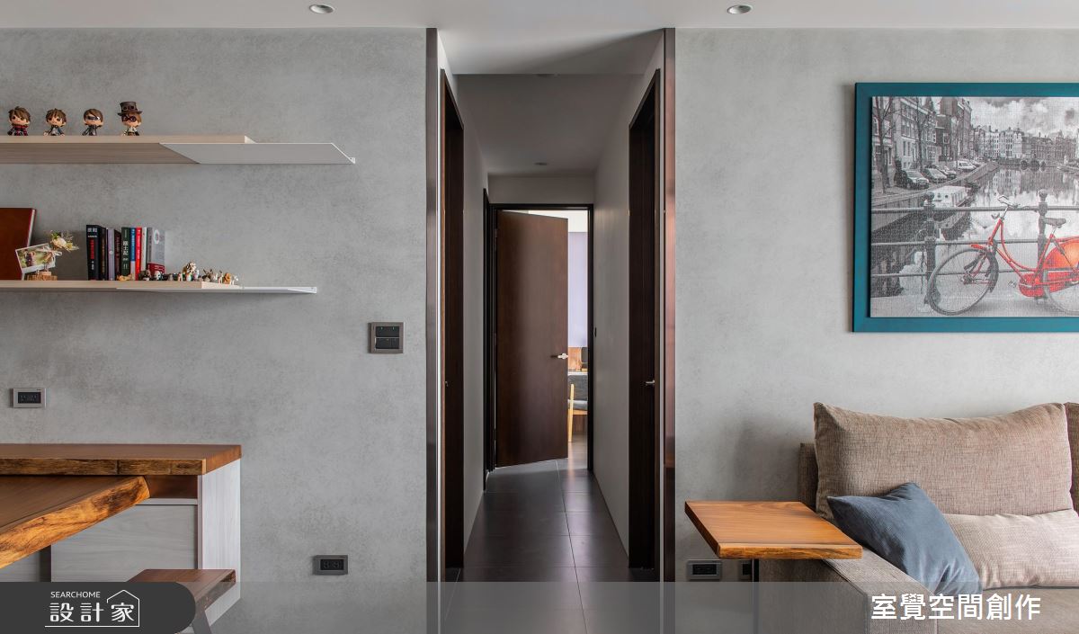 空間大量使用質樸建材,並融合精緻的框線語彙,在電視牆、廊道入口處加入金屬妝點,替家添入恰到好處的微奢華感!