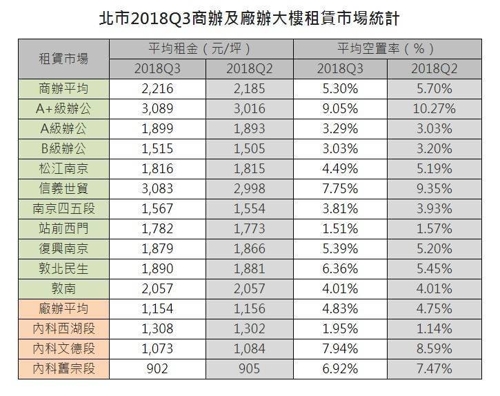 延續上半年的上升格局,北市商辦價格持續走穩,依據信義全球資產最新統計,平均售價維持在83.9萬元,各商圈售價都有明顯上漲的趨勢。租賃市場表現需求依舊旺盛,而近期又無新辦公大樓釋出,在這供不應求的狀況下,拉高了平均租金,Q3上漲至2,216元,而空置率更是降至10年新低 。內科廠辦部分,平均售價小幅上升至51.1萬元,平均租金維持在1,154元。整體而言,商用不動產市場持續加溫,辦公室需求強勁,許多大型企業轉向總部化,整合散落各地的辦公室,一次進駐頂級商辦承租大坪數。