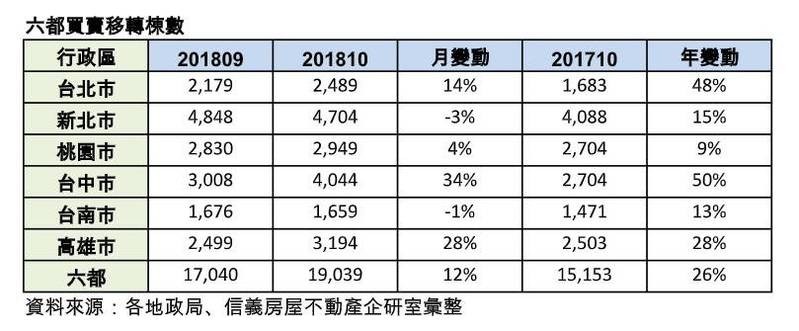 根據六都公布的建物買賣移轉棟數資料顯示,六都10月買賣移轉棟數為1.9萬棟,較上個月成長12%且較去年同期增加26%,主要仍是受到10月的地政機關工作天數較多,加上房市交易狀況穩定與交屋帶動影響,許多區域10月移轉出現大幅增加的狀況。