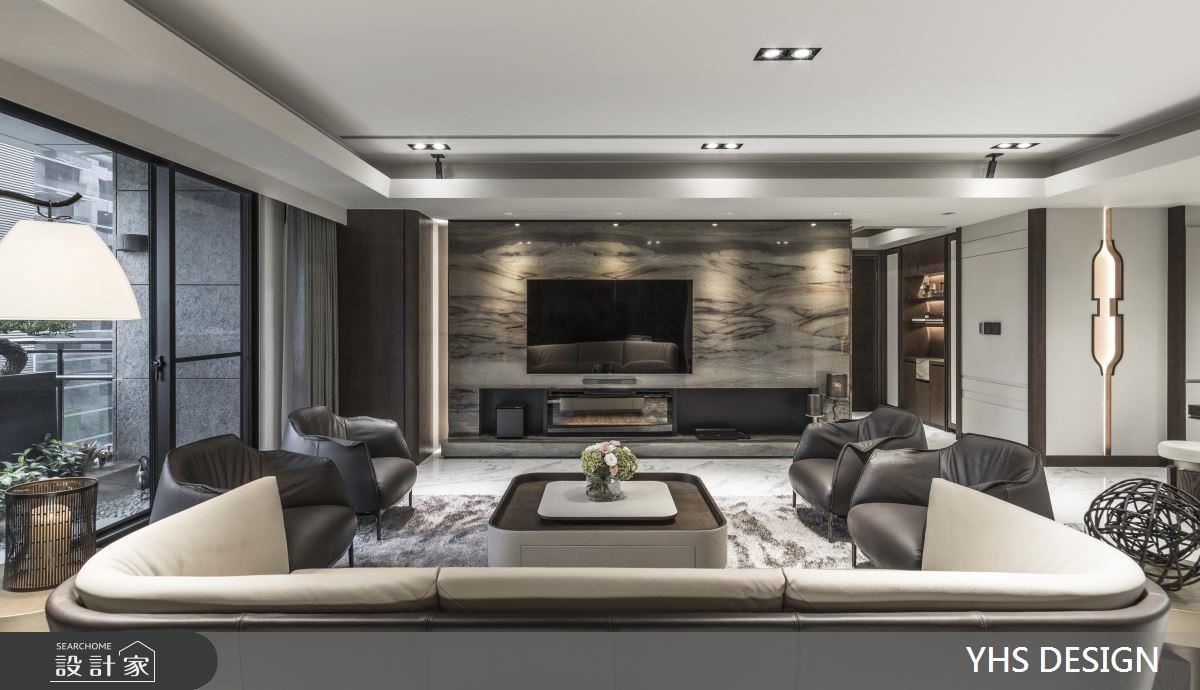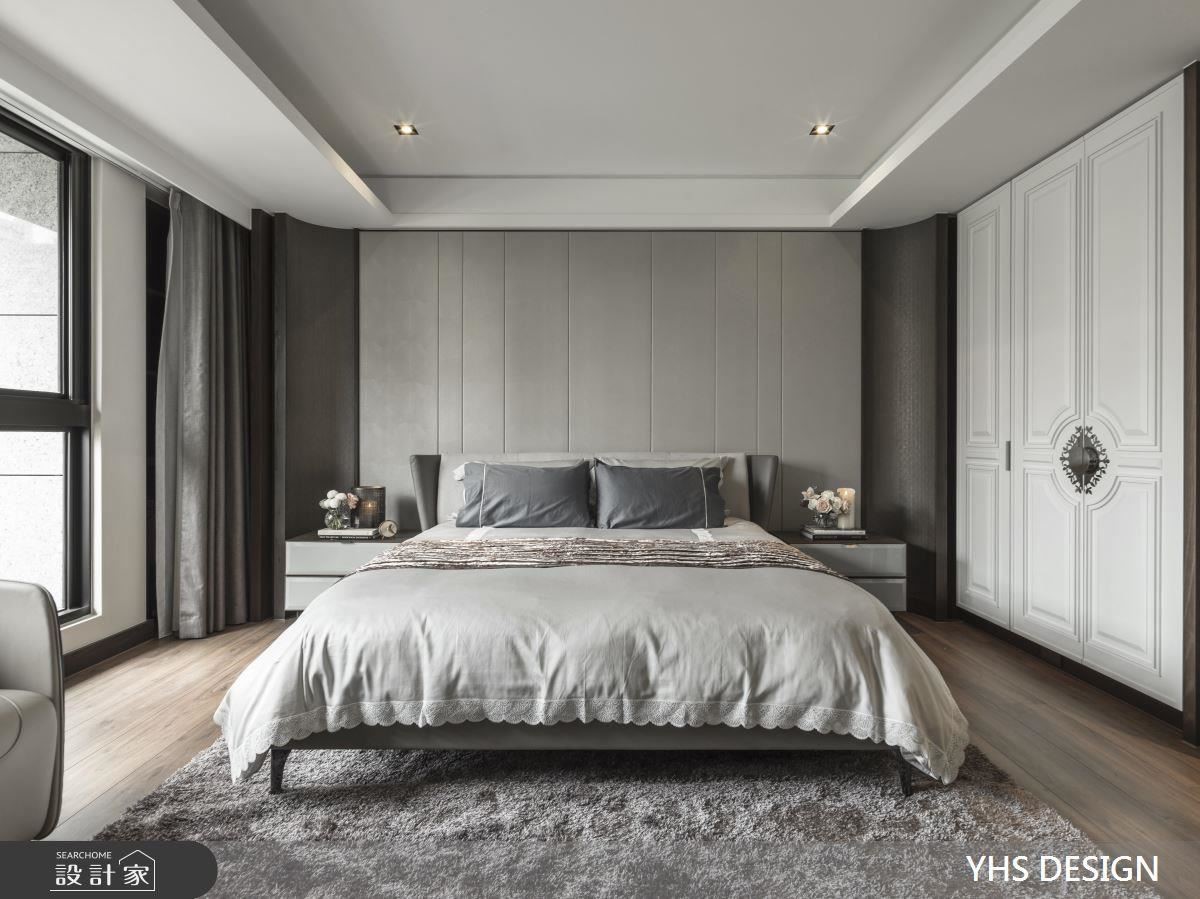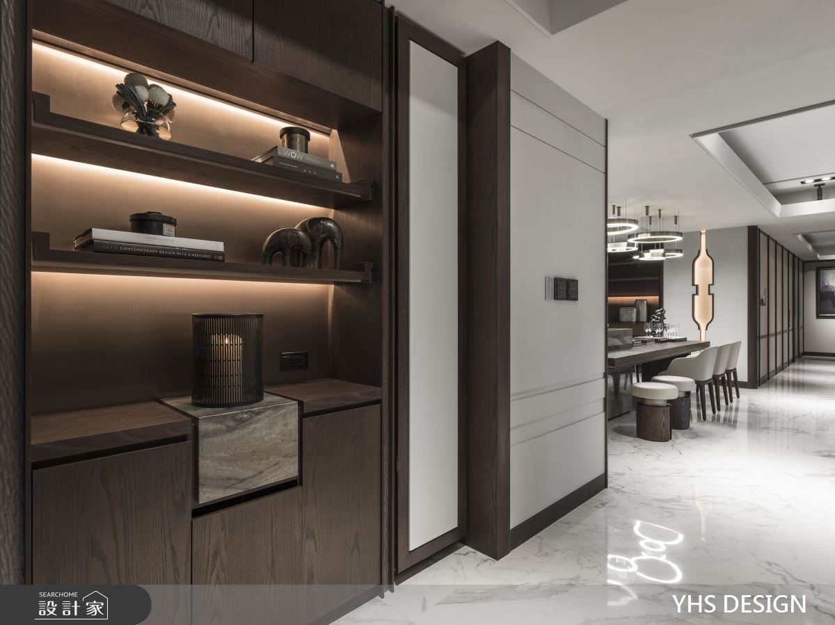 淺色地磚、大器石材鋪陳於白色空間,雖然清爽卻略冷清,設計師適時代入深咖啡色木紋與鍍鈦金屬溫潤氛圍,提升低奢質感。入口玄關設置深色精品櫃,以深木紋作為牆面飾邊,讓屋主收藏成為迎賓端景,一進門就能感受人文氣息;另一側木作以弧度取代稜角,導引進入客廳的動線,同樣的圓弧設計,也出現在主臥床頭,衣櫃則以細膩線板妝點,更符合女屋主的生活情調。