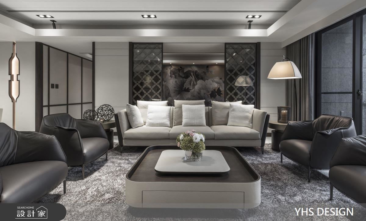 因應屋主個人品味,融入東方基調以及適時柔化空間的線板,更具人文與雅致的色彩。大面積的電視牆下方,有著調整氛圍的壁爐;沙發後方則是獨立起居室,以屏風取代牆面隔間,荷花的牆飾,以鍍鈦金屬腐蝕刻畫出荷花圖樣,高貴典雅獨樹一格,精緻的工藝,化身客廳最迷人的端景。在陽台綠意與明亮採光映襯下,更顯意趣。