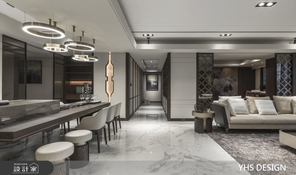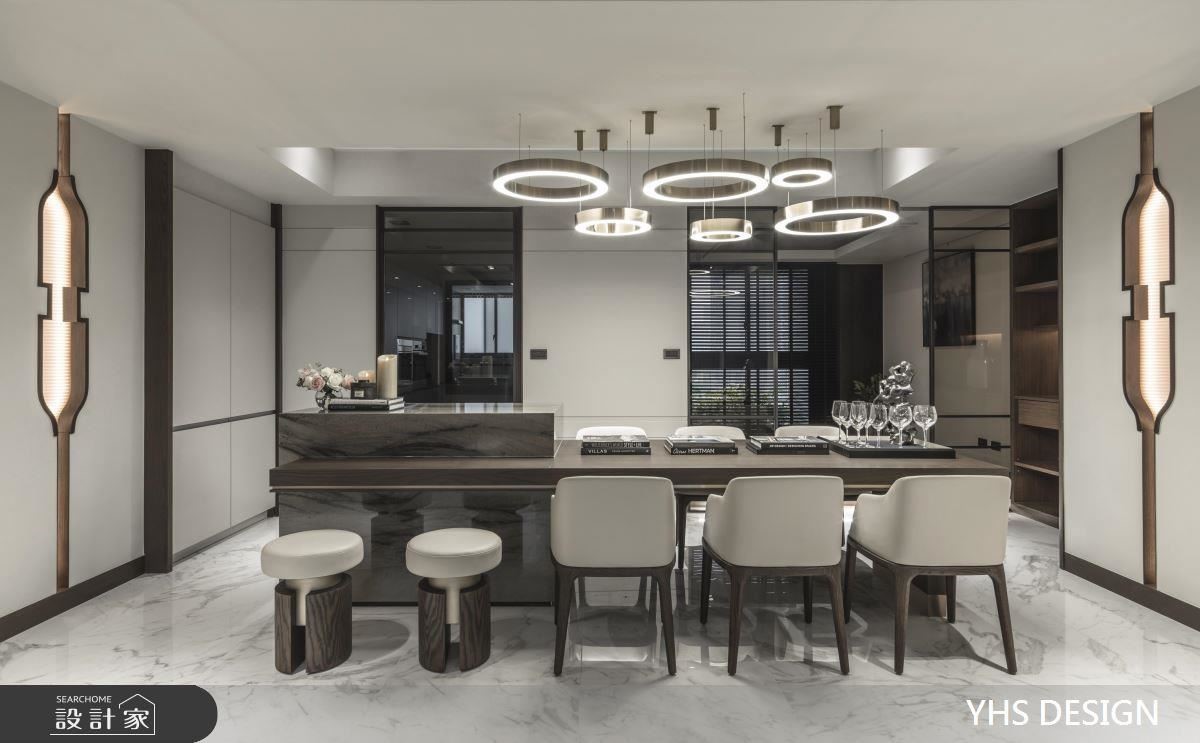 長餐桌嵌入中島吧檯內,木與石的材質各自表現卻又能搭配呼應,上方以象徵圓滿的圓形燈具,凝聚視覺焦點。兩側牆面以 YHS DESIGN 設計獨具的圖騰相對稱,金屬飾邊嵌入間接照明;後方則以鐵件玻璃門片取代實牆,與茶室、廚房成為通透的共同存在,對喜愛下廚的女屋主來說,無論料理、待客,都享有餘裕的空間,是她極為中意的生活角落。