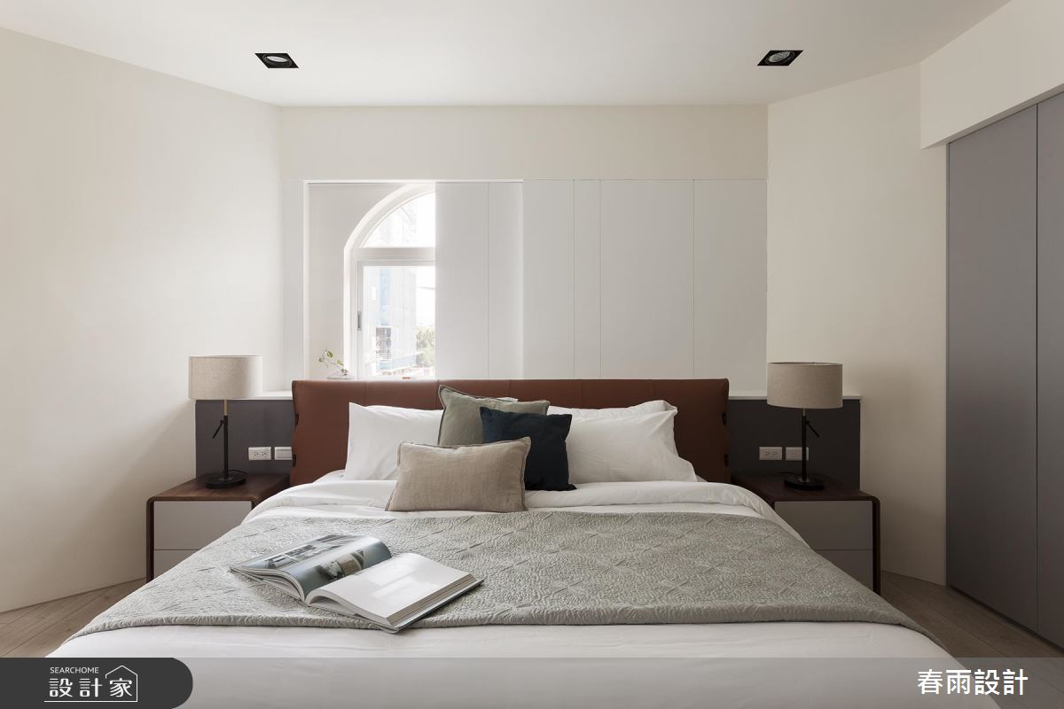主臥空間裡,床頭以白色拉門彈性遮蔽窗戶設計,隨著屋主使用上的需求來開敞門片,床頭與床尾皆設計滿滿的收納機能,創造出實用的生活空間。
