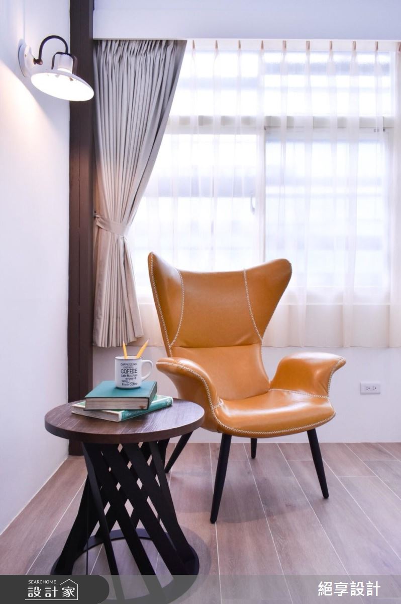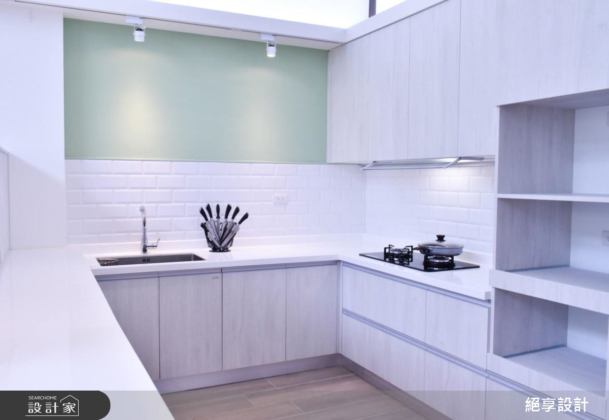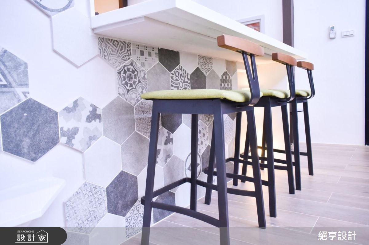 延續老屋的三角斜屋頂,拆除低矮天花板後,在屋頂加裝三角玻璃窗接引戶外光源,讓陰暗的屋況注入採光;整體空間以大量的白色系飾底,再以屋主喜愛的蘋果綠色調點綴,創造出主視覺牆面,洋溢著滿滿活力,而老舊窗框點綴其中,象徵塵封美好的舊回憶;公領域裡,以電視牆銜接中島的設計手法,界定出客、餐廳,讓動線簡約、明確,更顯開闊、寬敞的空間氛圍,低調灰色系的花磚形塑牆面造型,展現復古優雅風貌;中島兼具餐桌機能,檯面串連至廚房工作檯,一體成型的設計串連整體機能,讓料理、用餐與在客廳看電視的家人們能彼此互動。
