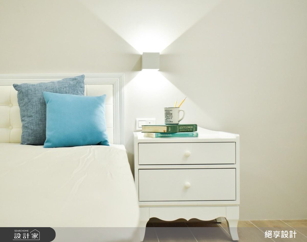 主臥空間裡延續公領域的蘋果綠色彩,簡約的壁面上搭佐兩盞放射狀的光源,映照出清新、柔和的休憩氛圍。