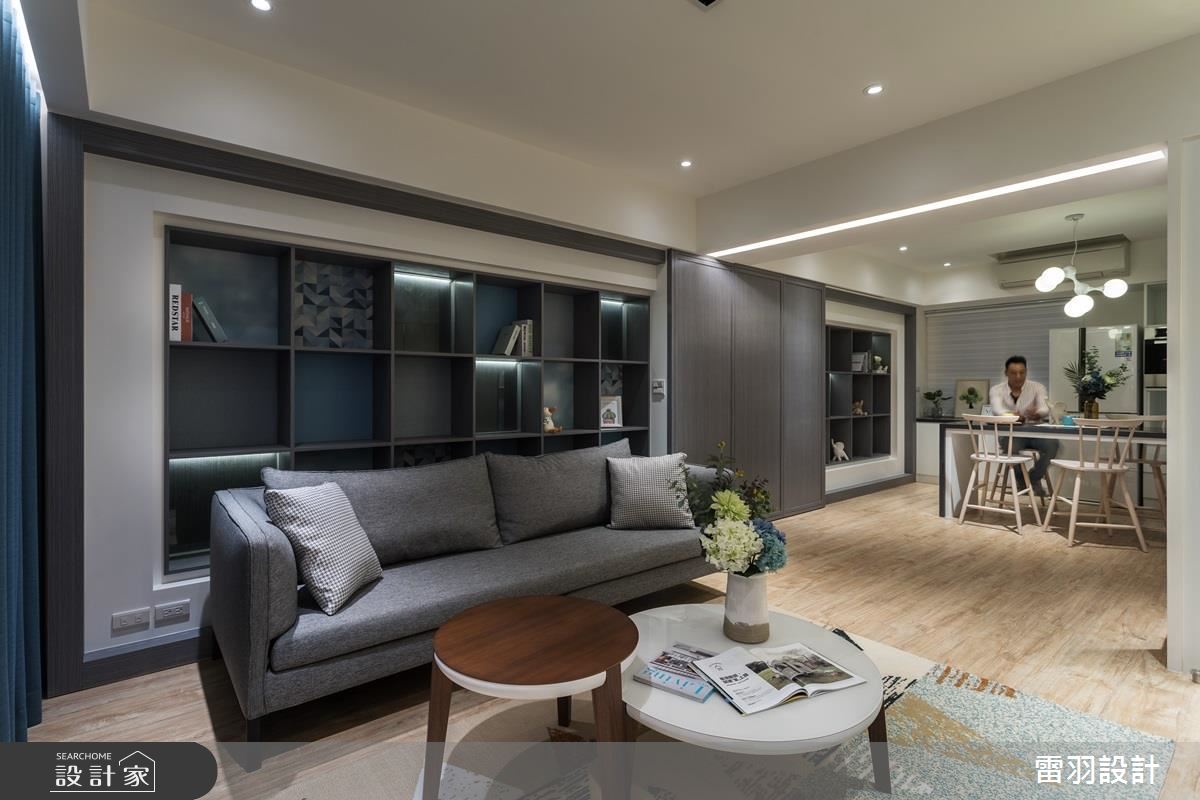 介於客餐廳之間,玄關旁設立一整面收納櫃,並規劃臥榻區域,能夠讓人在此穿鞋、看書都沒問題。原本客廳的沙發背牆和餐廳牆面深度不同,中間又隔著柱子與廊道,使得立面視覺凹凸不平,因此設計師運用門片隱藏廊道,並利用櫃體調整隔間,讓居家空間方正不崎嶇。