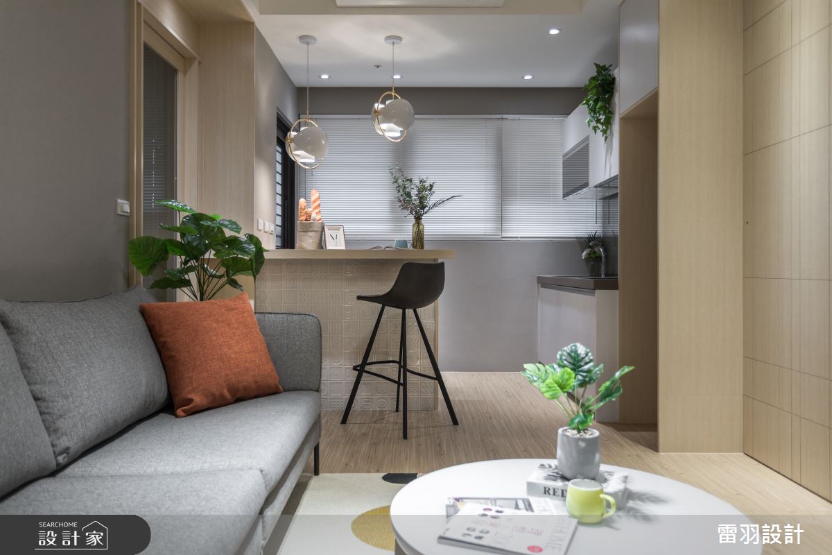 透過吧檯界定出客廳與廚房領域,且將原有的廚具縮小尺寸,可納入冰箱的寬度來調整,並藉由吧台下方的空間來收納電器,滿足日常的烹調所需。