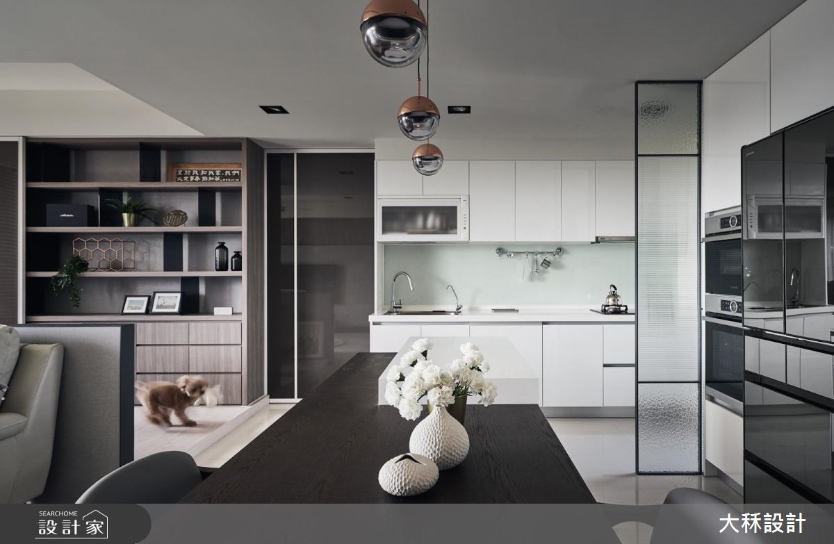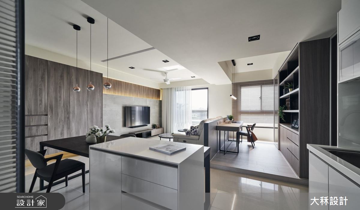 從玄關櫃延伸客廳電視牆上方的木質肌理,搭配著燈光的隱隱妝點,美好畫面油然而生,藉由細緻木紋特性提升視覺質感;並透過開放格局的整頓,保留舒適合宜的空間尺度,輔以簡潔俐落的動線分割,將客廳、書房整合在廊道左側,給予大量的溫煦木皮妝點,右半側則是俐落清爽的餐廚空間,完整切分出不同的主題氛圍,書房內櫃體,更加入開放式與彈性門片設計,一舉滿足屋主展示與收納的需求;餐廚領域,則經由設備與櫃體的規劃巧思,大幅提升廚房空間感與機能性,並針對開門見灶的風水問題,規劃通透屏風做出阻擋,既保有光線流通性,也增加了視線上的曖昧趣味性!