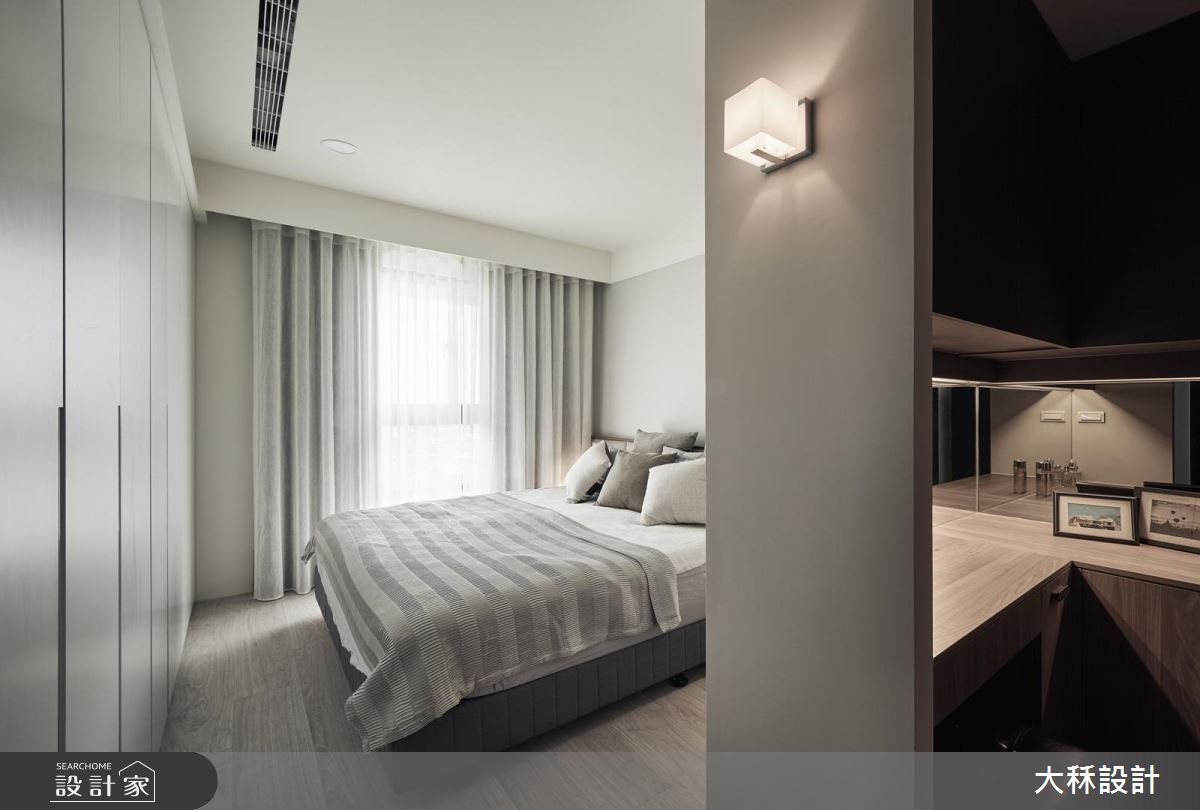 舒適靜謐的睡寢空間,利用一小區塊打造成迷你更衣間,且配置壁燈暗示著場域轉換,並結合梳妝台設計,使用上更加便利!