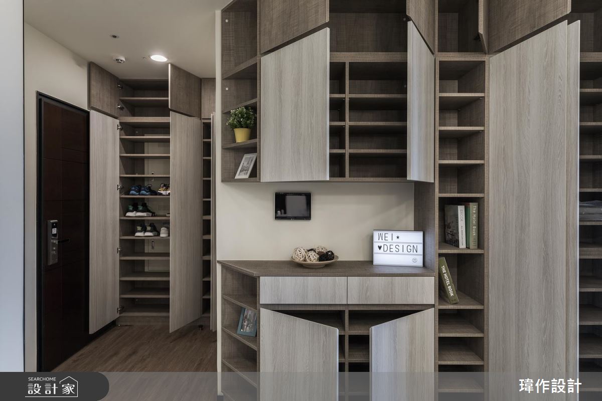 旋開大門走進室內,玄關處鋪設木紋地板,並安排木作鞋櫃,傳遞溫潤的家屋氣息;一個輕轉彎,壁面以大量的系統櫃作為收納,並一路蔓延到餐廳領域,乾淨、簡約的櫃體設計,兼具封閉與開放層板,營造出清爽又機能滿載的機能家屋。客廳落地窗引援戶外城市美景與自然光,替開放的公領域增添景深與溫度;由於電視牆面垮度過小,因此右側結合格柵造型,讓牆面視覺更為延伸;沙發背牆巧遇大樑,利用畸零空間結合層板展示機能,而隨著物件的更替,展現人文美學色彩;餐廳靠進玄關區,利用餐桌椅擺設自然創造用餐環境,天花板則藉由放射狀的球形燈飾點綴,擦亮視覺亮點。