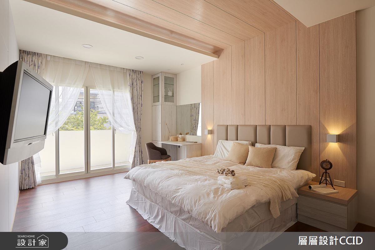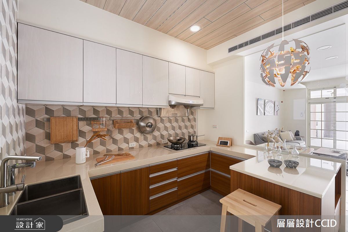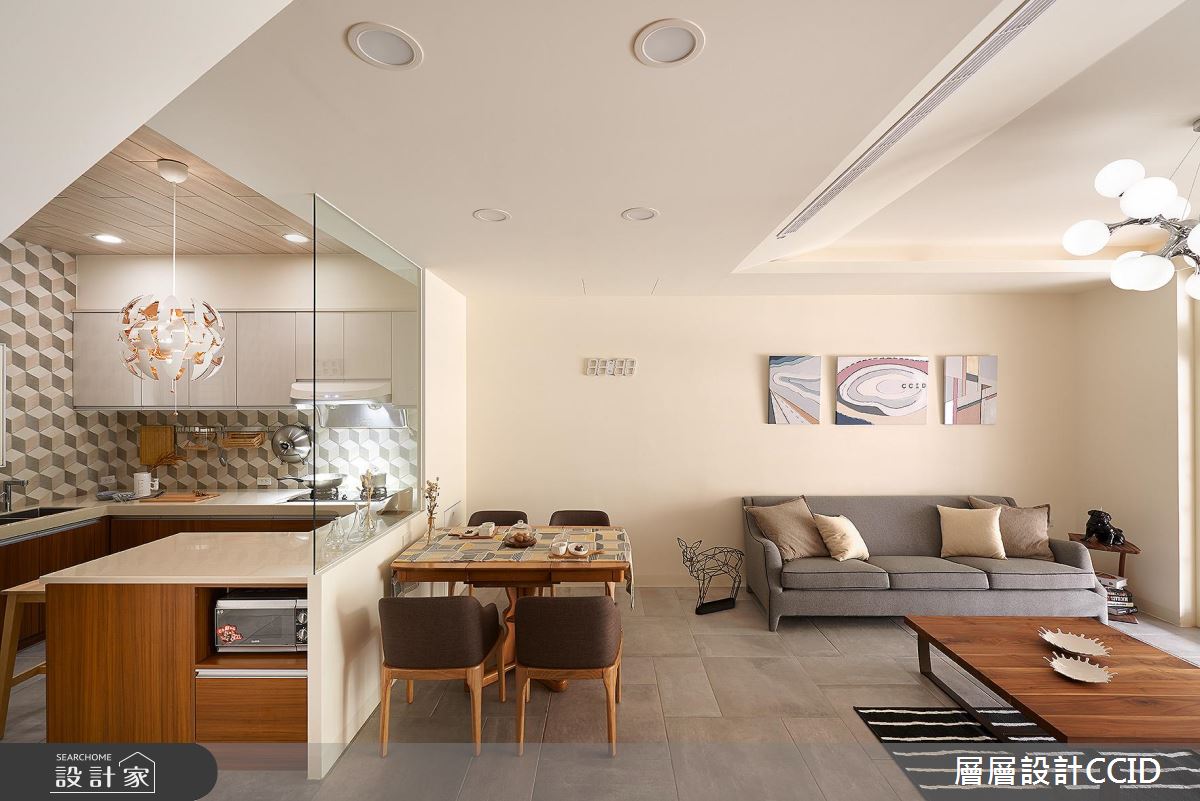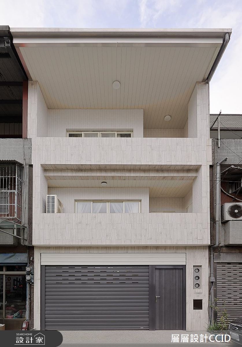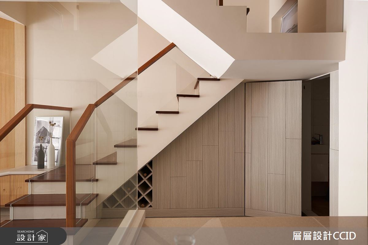 三層樓老屋由內到外以米白色點亮視覺,翻轉老舊透天別墅的陰暗印象。客廳透過溫潤的木質調性,妝點電視牆,同時分出空間給餐廳使用。廚房隔間部分採用玻璃材質,讓光線能夠穿透,又能擁有一定阻隔感。樓梯下方隱藏浴室和儲藏室門片,並規劃開放式的酒櫃,善用了畸零空間。