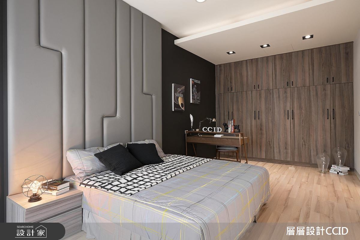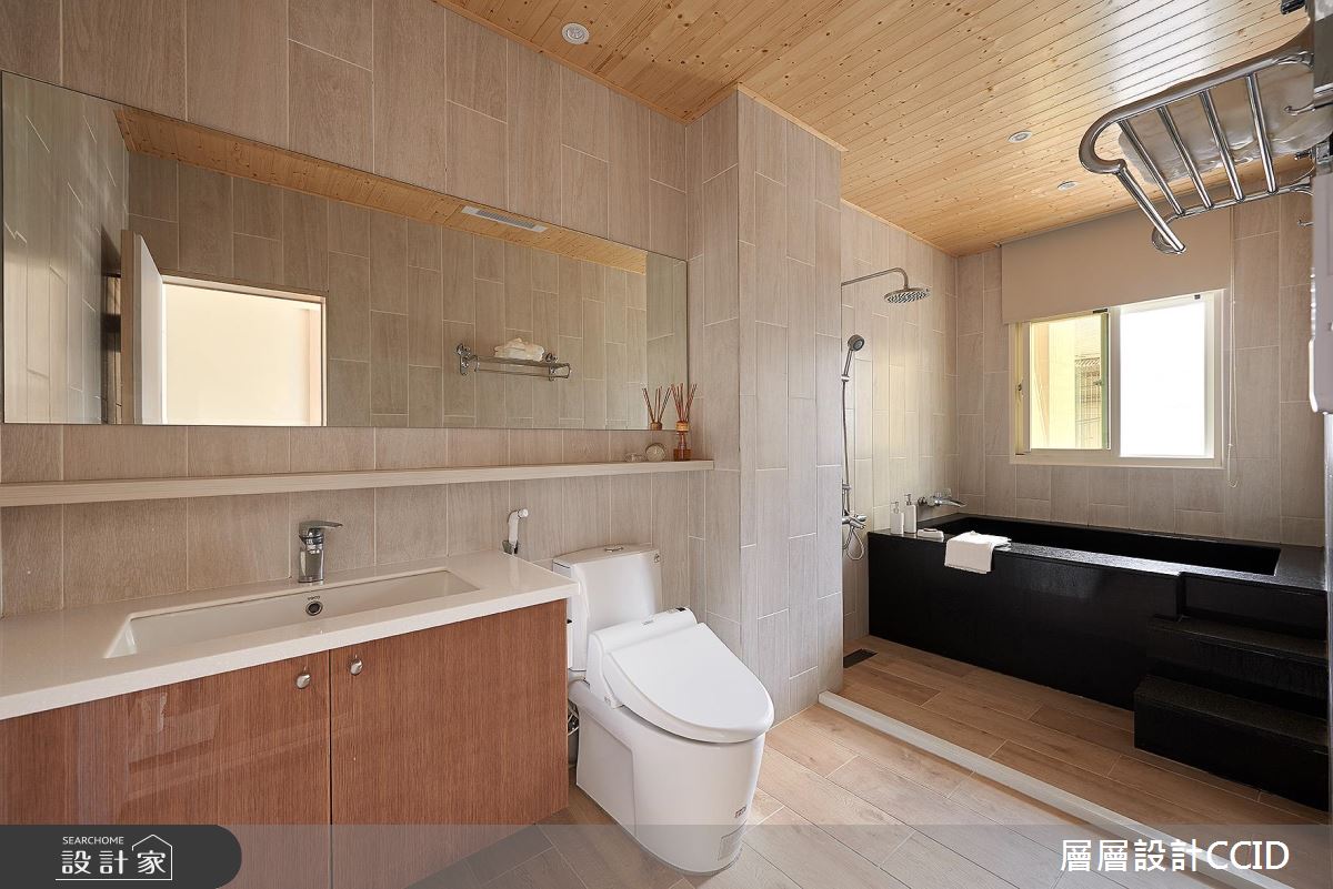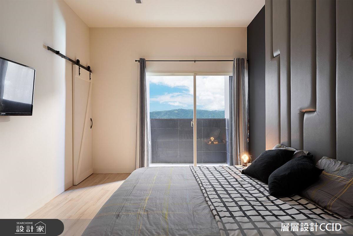 主臥採取淺色木皮從天花延伸到床頭牆,其餘立面則保持潔白,讓空間呈現明亮又溫暖的氛圍;兩片小天花以床為軸線,開展出柔和的對稱美感。主衛選擇木紋的深淺變化,修飾天地牆和櫃體,且設置了黑色石砌浴缸,營造放鬆氣息。次臥擁抱窗外優美山景,整面收納櫃與書桌打造了沉穩的閱讀環境。