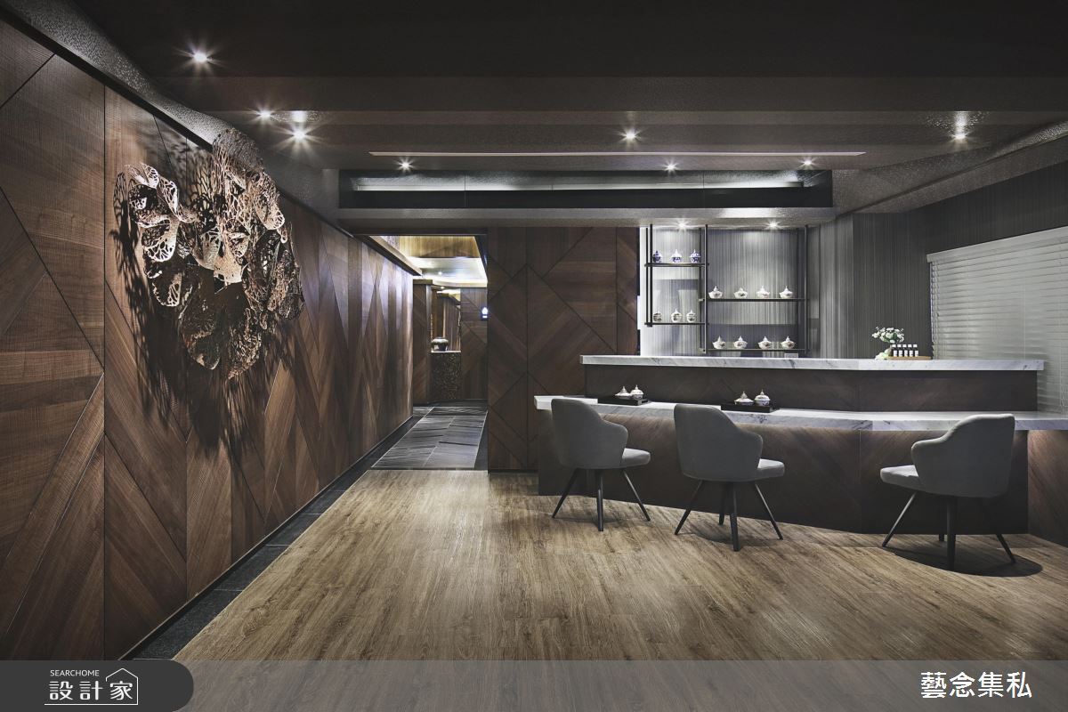 空間前身為經營夜間娛樂用途,又經歷多次整改,對於設計師而言,最困難的就是如何在低矮的樓高限制下,順應SPA及芳療用途,整頓紛雜凌亂的管線。首先,在入門大堂的規劃上,以大理石的水墨肌理及深邃的色澤做為迎賓主視覺,並避開了低矮的樓高,將此處的所有管路彙整在大樑下方,以樹枝伸展的姿態作為鍍鈦鏤空雕刻的主角,轉移樑柱低矮的視覺效果,兼顧場域情境及收攏管線的問題。