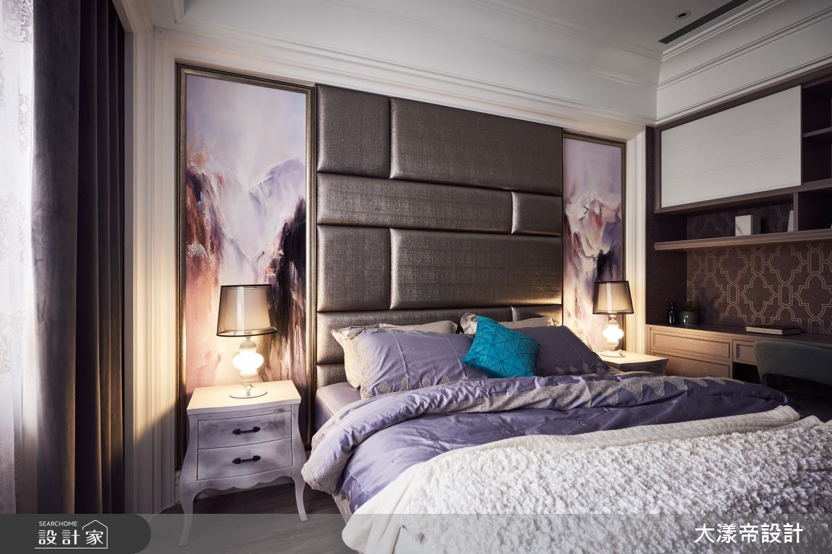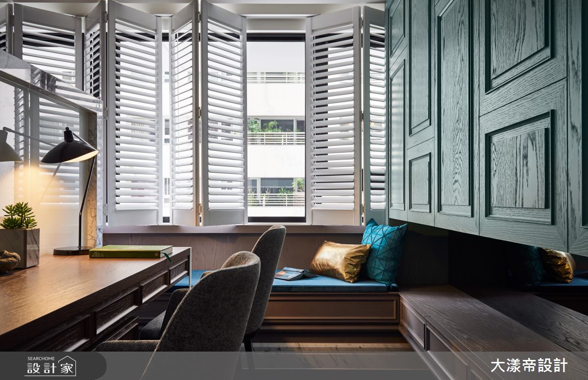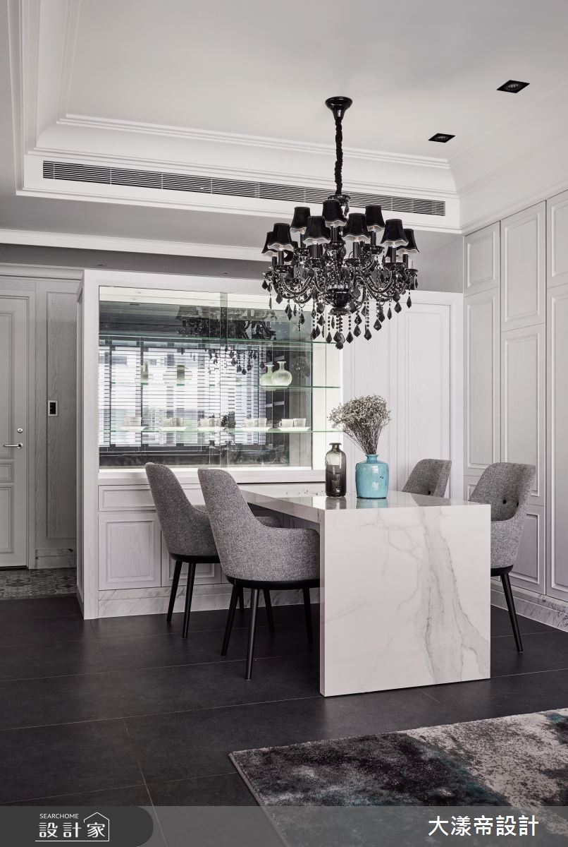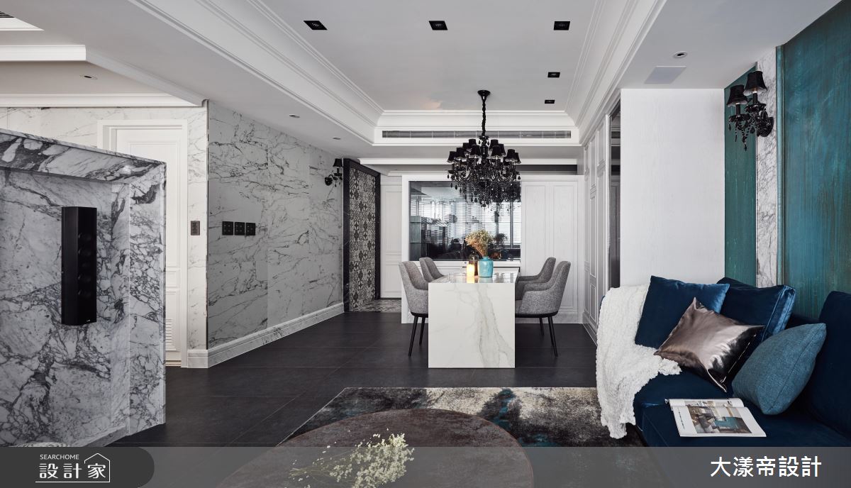 餐廳透過櫃體的線板語彙,搭配深黑的水晶吊燈,界定了格局的新古典調性,而牆面的大理石紋理,像是泡沫一樣緩緩升起,呼應空間的海洋形象。電視牆後方的書房,以收納櫃的祖母綠為空間亮點,配合鏡面的反射,打造敞亮的閱讀環境。主臥則選擇銀色繃布及藝術壁飾,打造床頭牆的高貴質感。