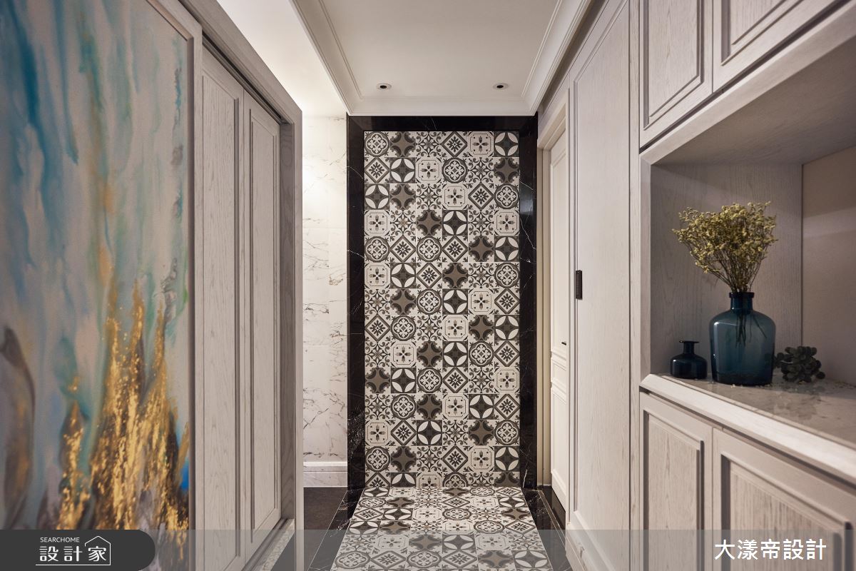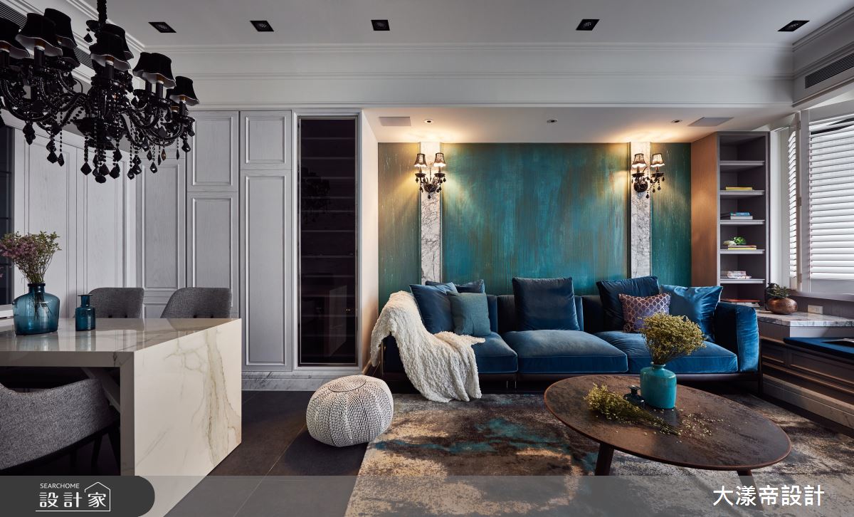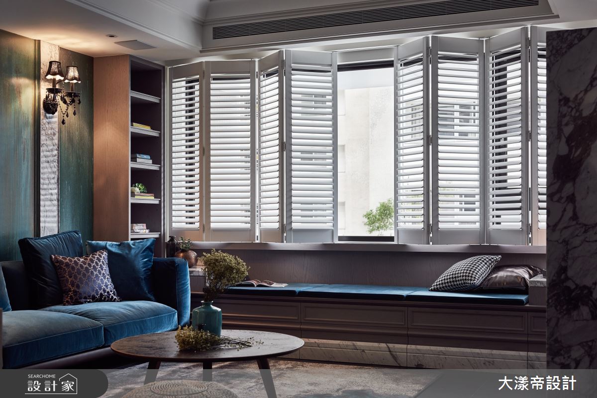 玄關自地坪延伸至牆面,鋪設花磚,並掛上帶金壁畫,宛如藝廊般開展出典雅氣質。開放式公領域透過一整面美式木百葉,將光線微微引入室內,打造優美的立面表情。客廳從地毯、沙發、臥榻到主牆,使用不同層次的藍,彷彿潮水漸漸濕潤居家視覺。