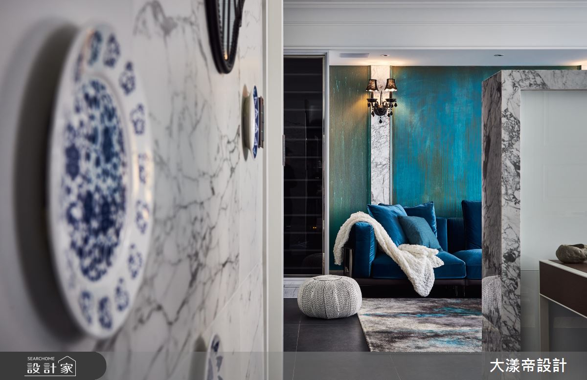 通往私領域的走道,懸掛青花瓷盤飾牆,替空間添加東方韻味的同時,也與「藍」的整體概念相襯。