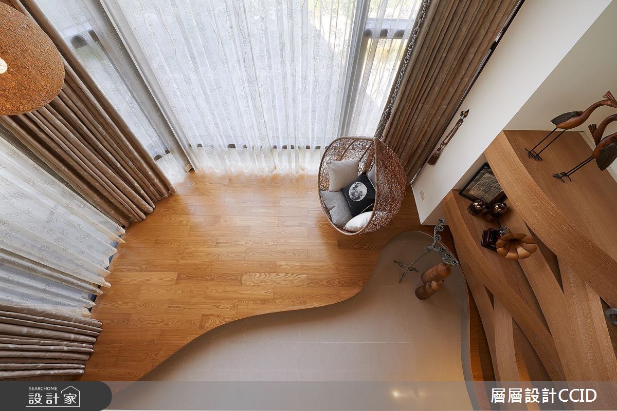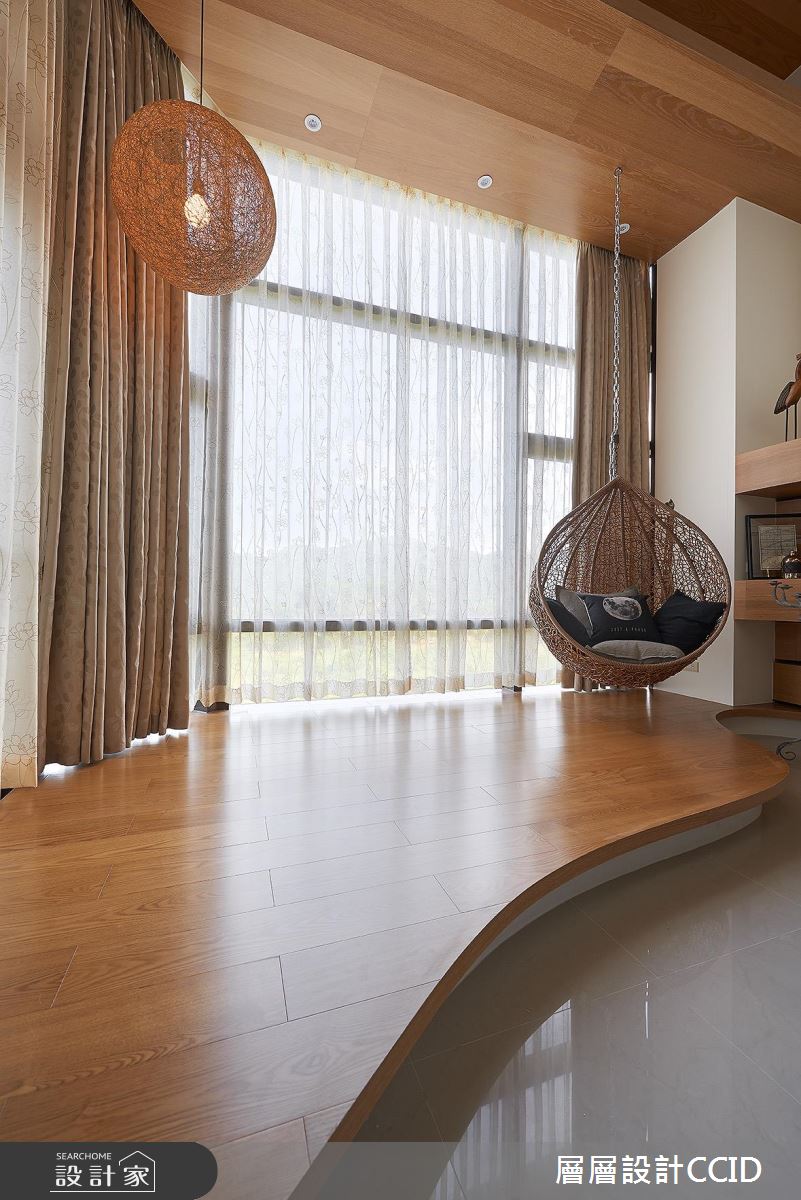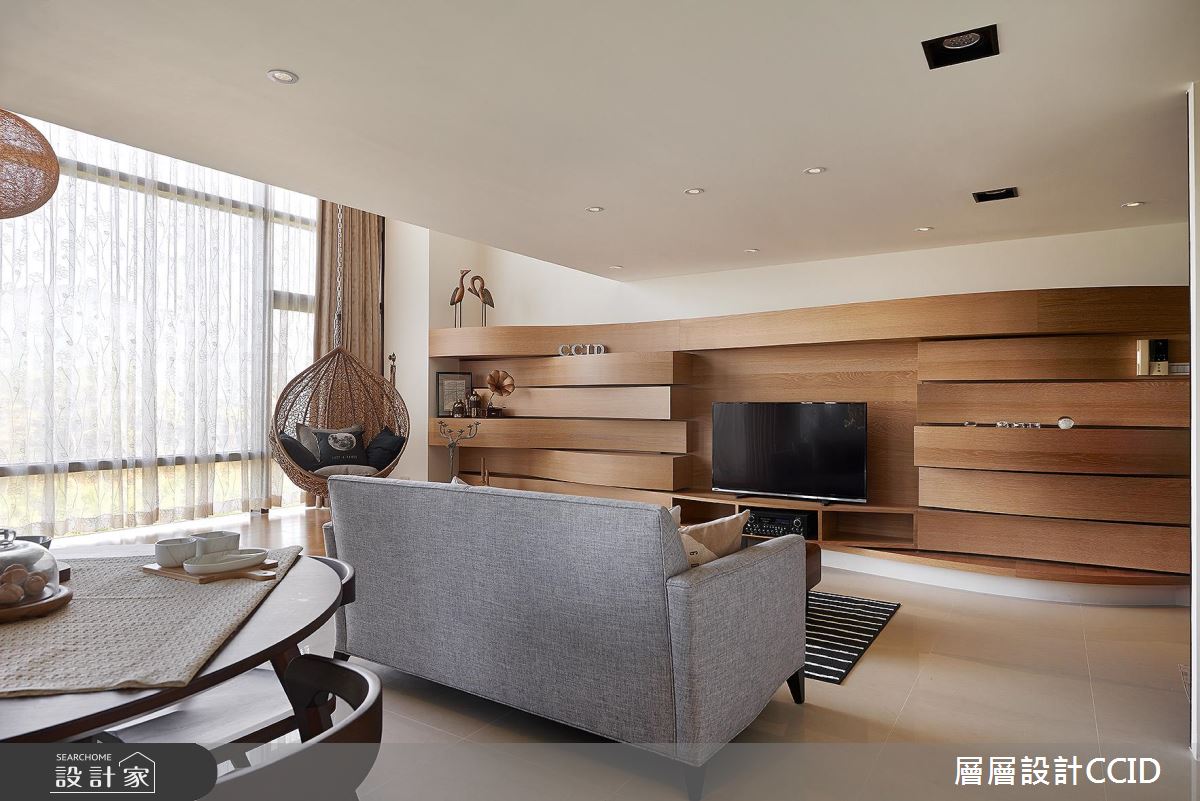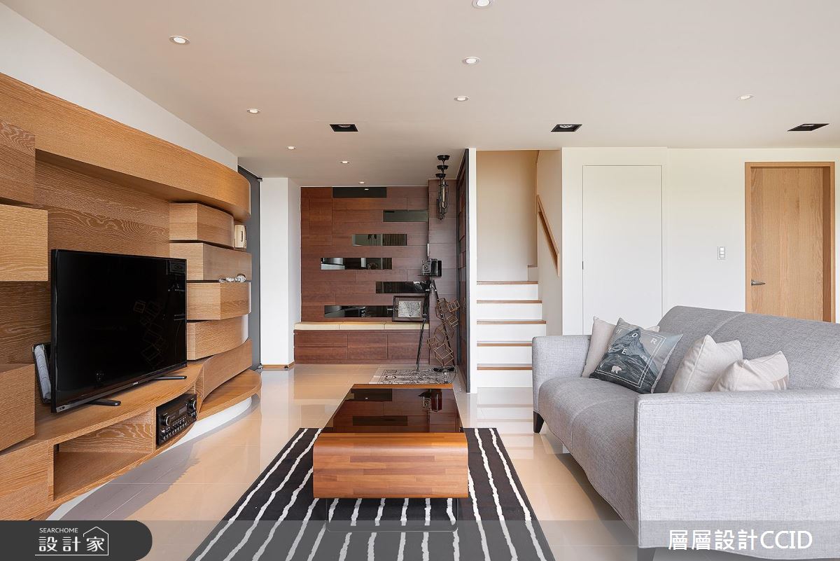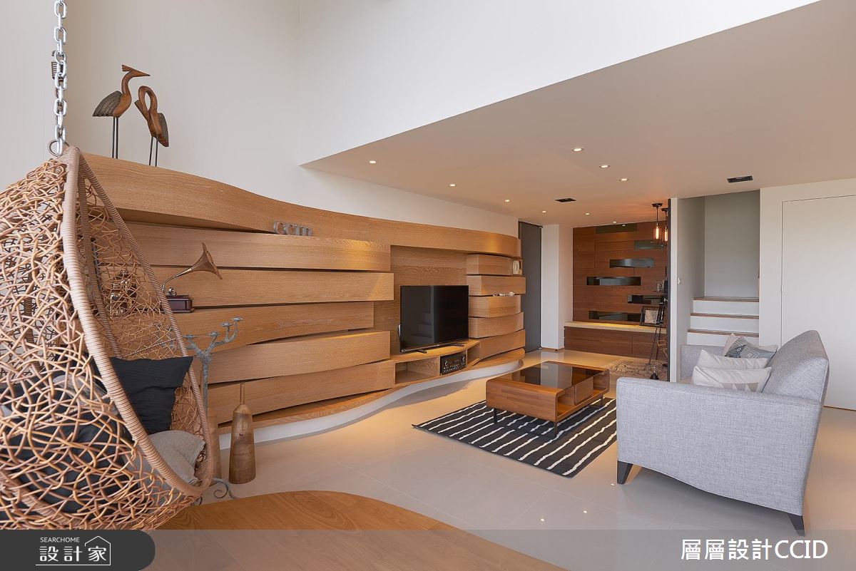循著玄關轉折進入客廳,可見到鏡面融入木質牆的亮眼設計,流洩出新穎的空間基調,且讓客廳電視牆跳脫傳統,透過塊體的堆疊空玩轉立體飄浮感,製造出牆體的活潑度,並伴隨線條造型的修飾,巧妙引導行進動線、一路串聯至窗邊;同時保留窗邊架高區域,賦予垂直向度的向上延展,形成挑高空間感,於樓上視線形成趣味連結,搭配著整面窗的的優美採光,造就開闊清朗的居家視野;臥房,則讓日光自由的灑進室內,迎進令人舒服的明亮感,結合一貫的留白與溫潤木質,打造令人放鬆的陽光寢居!