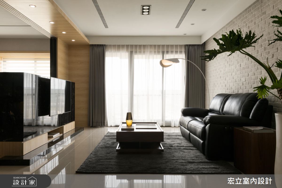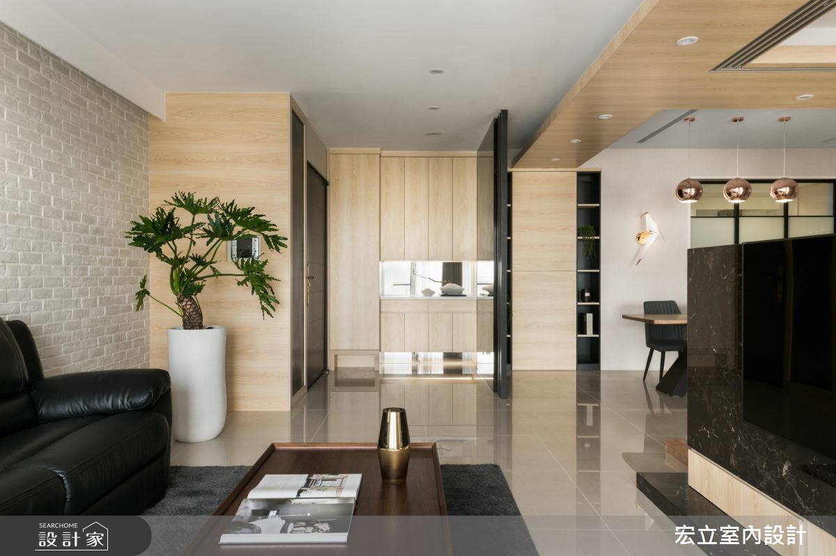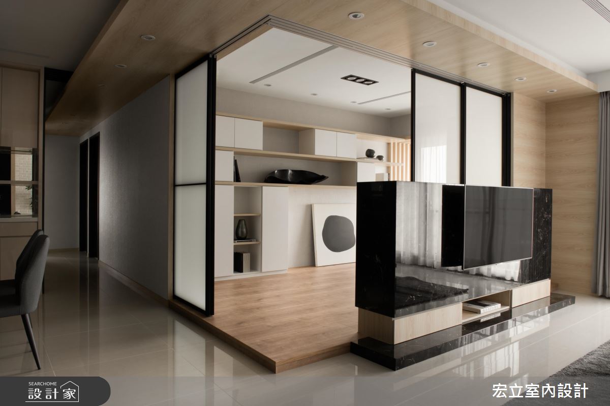 公領域巧妙使用木皮修飾大樑,並從立面延伸至天花處,劃分隱形的格局與廊道線!客廳文化石牆與大型落地盆栽的絕妙搭配,加乘簡約寬敞空間的溫馨與放鬆度,電視矮牆選用黑金鋒石材牆打造,細緻的紋理、有張力的穩重色調,跳脫淺木色空間成為焦點。格局變更後,從私領域釋放出的空間打造為多功能和室,平日為親子共享的紓壓角落,玻璃拉門的安排,能隨時轉換為客人的過夜房。