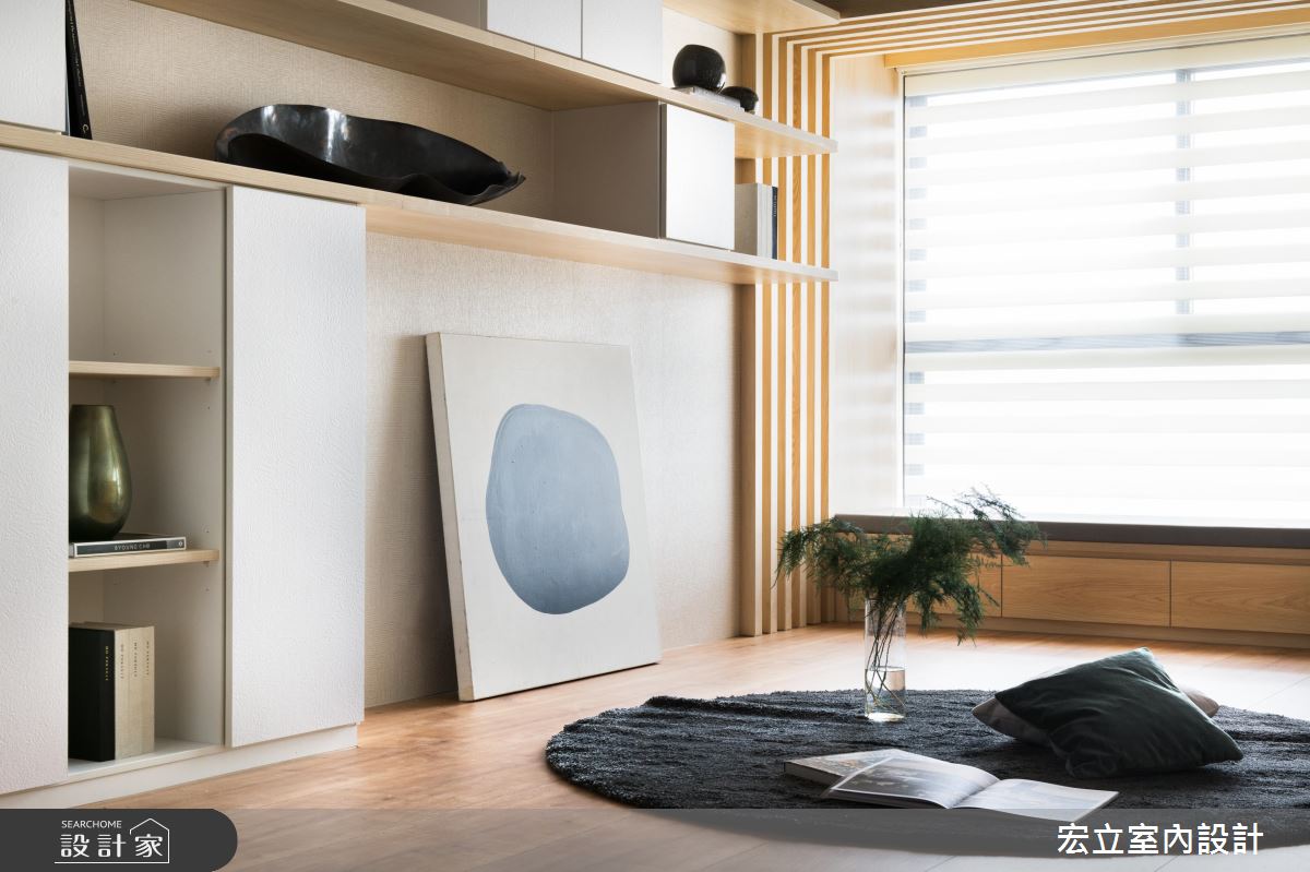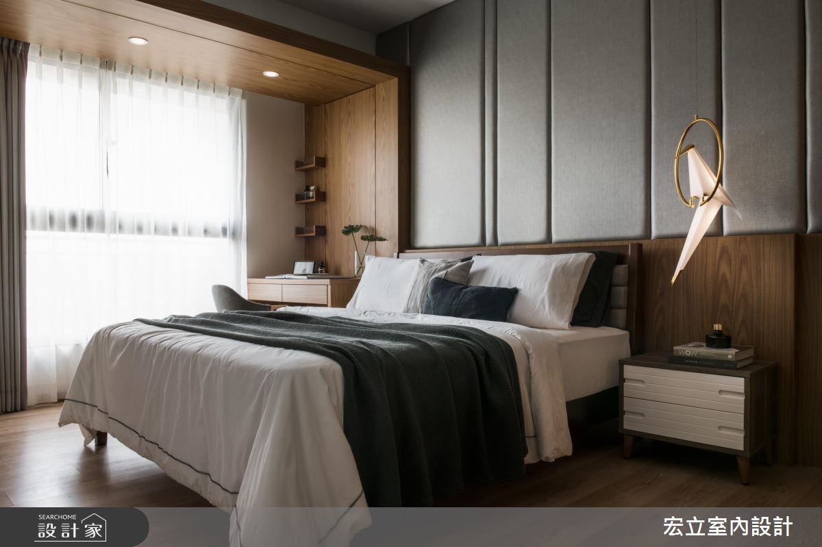 和室、主臥側邊上方的大樑,設計師皆使用木材化解。和室區,把低矮缺陷轉換為高度限制較低的臥榻,透過木隔柵修飾大樑,營造日式清新感;而溫潤的主臥空間,則將化妝台與隱藏式的浴廁門包覆於ㄇ字型的延伸木皮,化解了大樑突兀感,更為臥室框出一道日式端景。