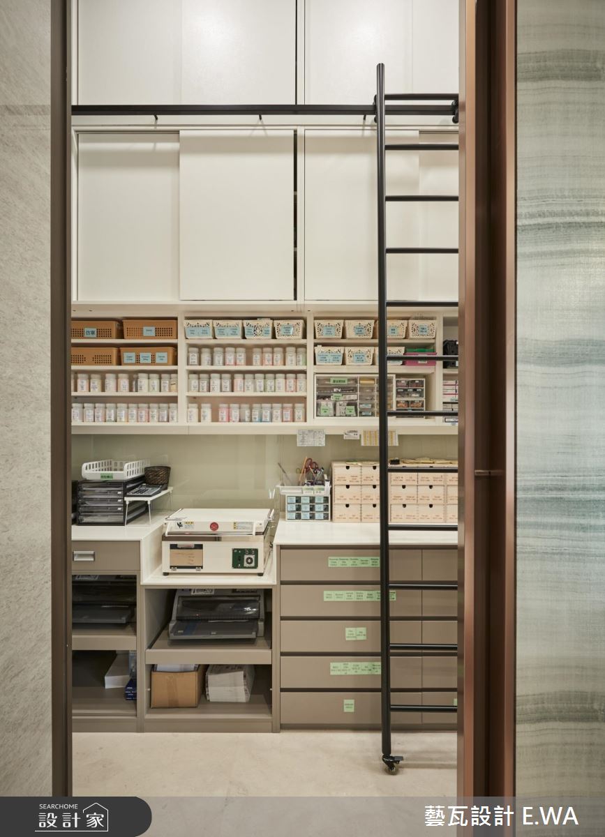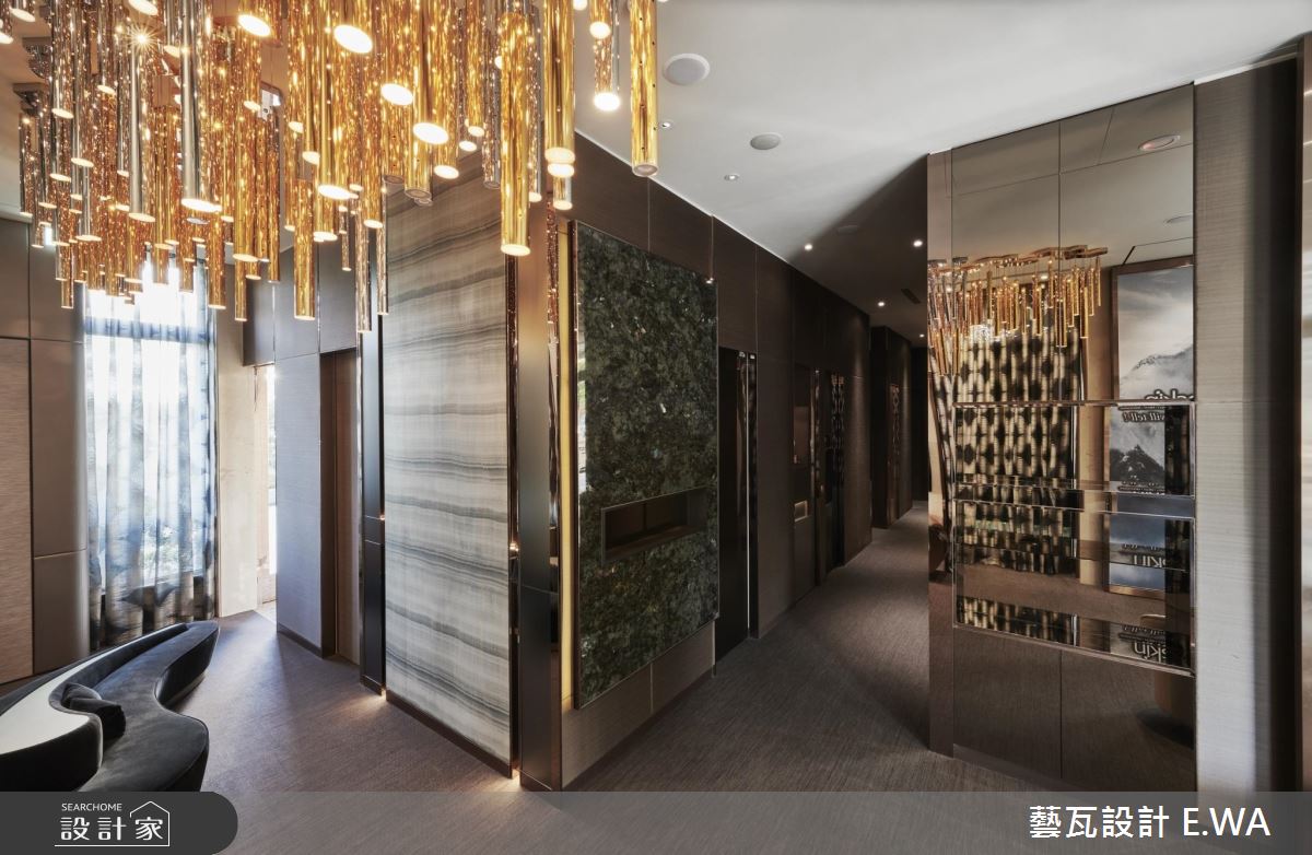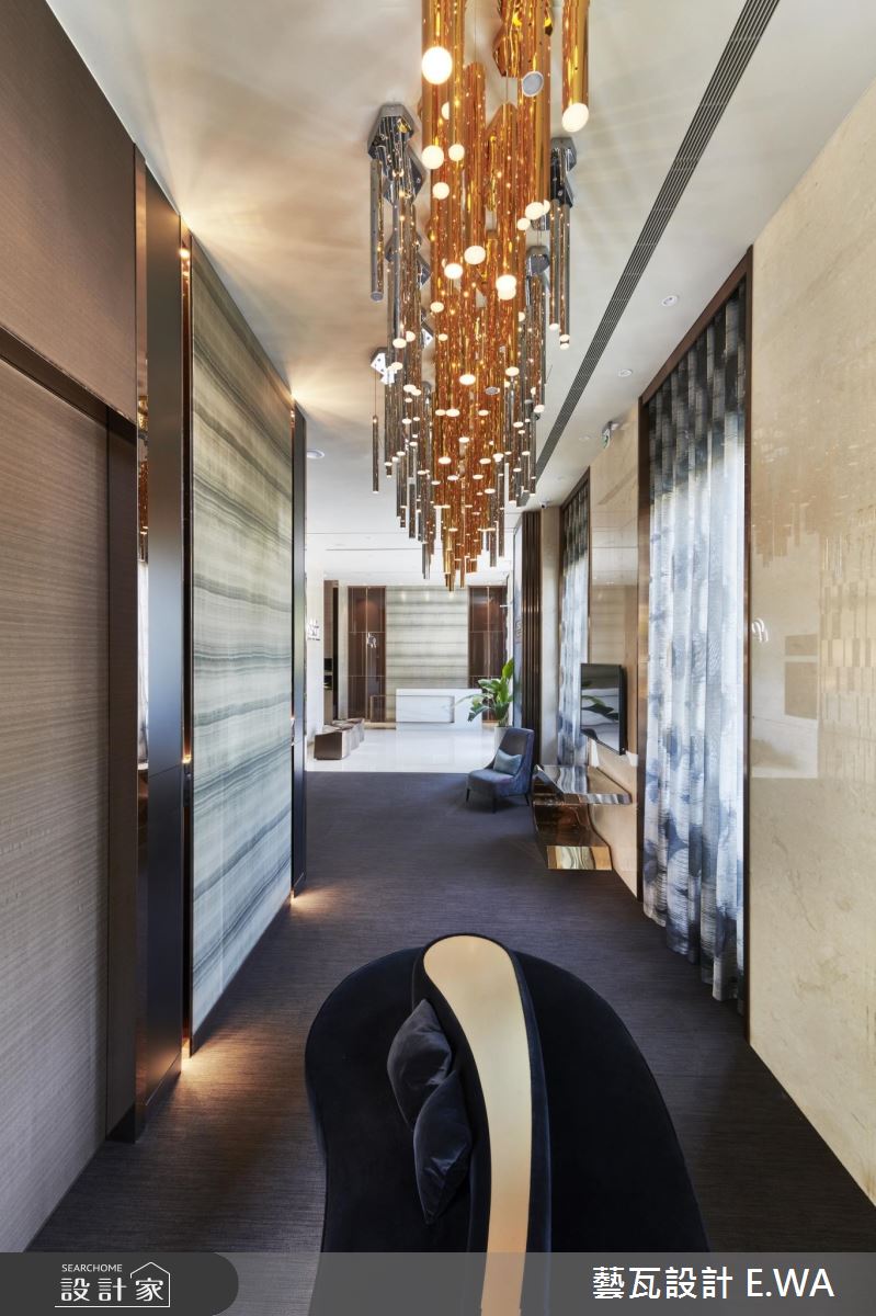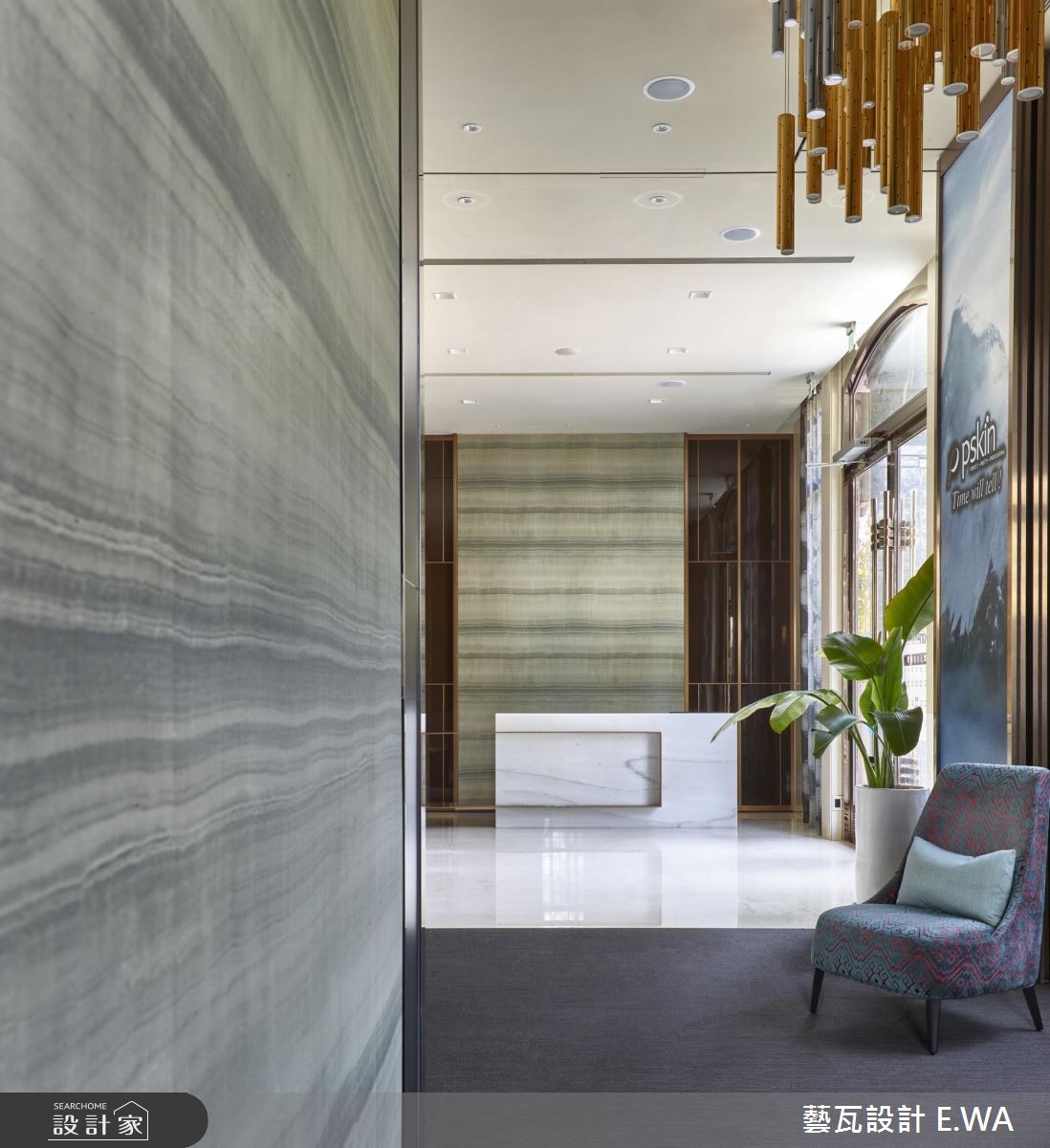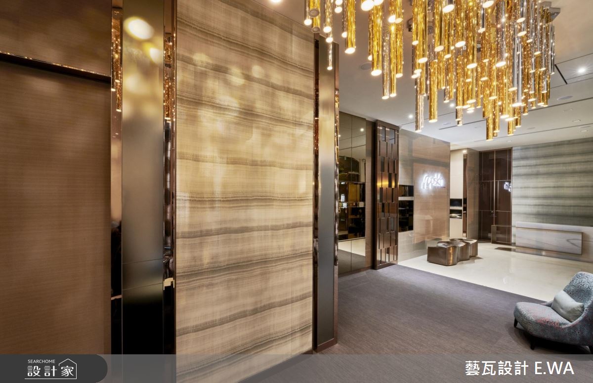 此案空間裡,設計師結合現代感的線條以及奢華元素,交織出器度非凡的絕美風貌,並利用大量的米色調鋪陳,營造出富有溫度的室內環境。從大門踏進室內,右側以白色調的大理石打造櫃台,並以鐵件造型框構出漸層視覺;接待大廳以大理石打造主視覺背板,LED燈烘托品牌LOGO,下方擺設金屬質感的流線型座椅,展現軒昂大器;大理石牆旁以不規則鏤空的金屬質感門扇,平時可收放進入牆面,營造更開闊的公共領域,或是將門扇拉開,界定出外部櫃台報到以及內部等候區;隨著光線映照展現一抹流光的造型拉門,與天花板上以金屬管狀排列的燈飾相互輝映,調和出華麗的等候空間,更隨著垂掛的華麗吊燈,成為空間裡美麗的路線導引,帶著到來的人們前往診間候診處。