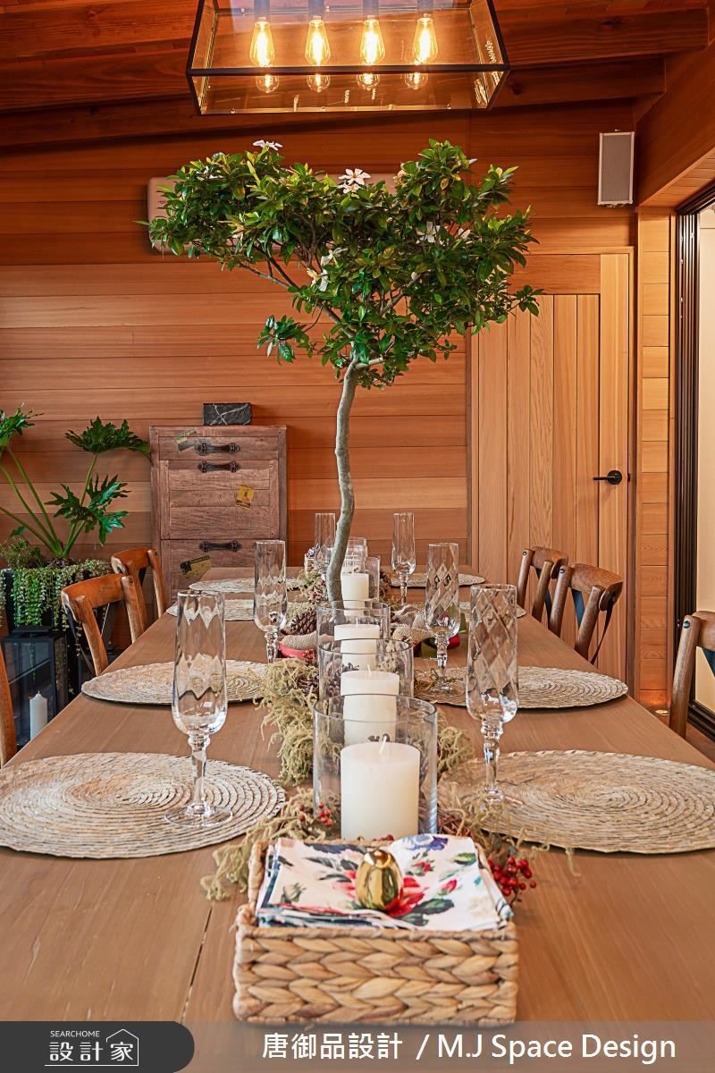 進門玄關考量穿堂煞問題,以鐵件搭配木材質規劃圓型端景,象徵屋主希望賦予的圓融氛圍,櫃體透過圓石石皮作立體切割,呈現出一種深淺映襯的視覺感受。客廳電視牆以用自然石材規劃,展現出空間主角的不凡器度,天花鑲入隱藏式投影機,以錯落不規則設計,呼應至電視牆的視覺層次感。餐廳整合會議室功能,並陳設符合空間調性的大理石桌子,藉由其斜線紋理及深淺色彩,為複合式空間點綴出別致的樣貌。小木屋以寮國檜木及美國香杉等高級材質規劃,營造出國外的舒適愜意韻味,透過復古紅磚及綠色植栽妝點,譜畫空間的另一抹色彩;餐桌上方特別規劃一扇天窗,讓空間跟戶外有所串聯,搭配上昏黃的燈光照明,使小木屋更有優雅舒適的度假情懷。