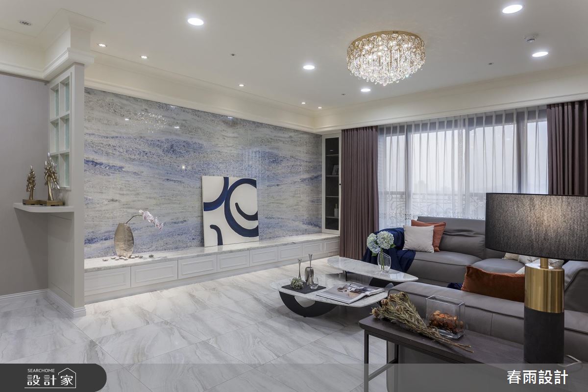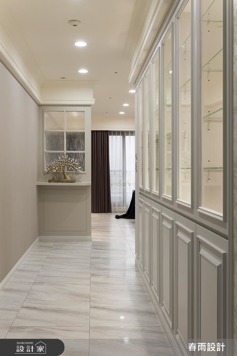 玄關透過隱藏門片的方式,將儲藏室收納於牆面中,並在通往室內的長廊,藉由透明的展示櫃,當作與書房的隔間,避免空間過於封閉陰暗。客餐廳選擇開放式設計,且以線板修飾的大樑界定區域。客廳採取藍色大理石點亮電視牆,配合富麗的燈具,提升空間的奢華感。