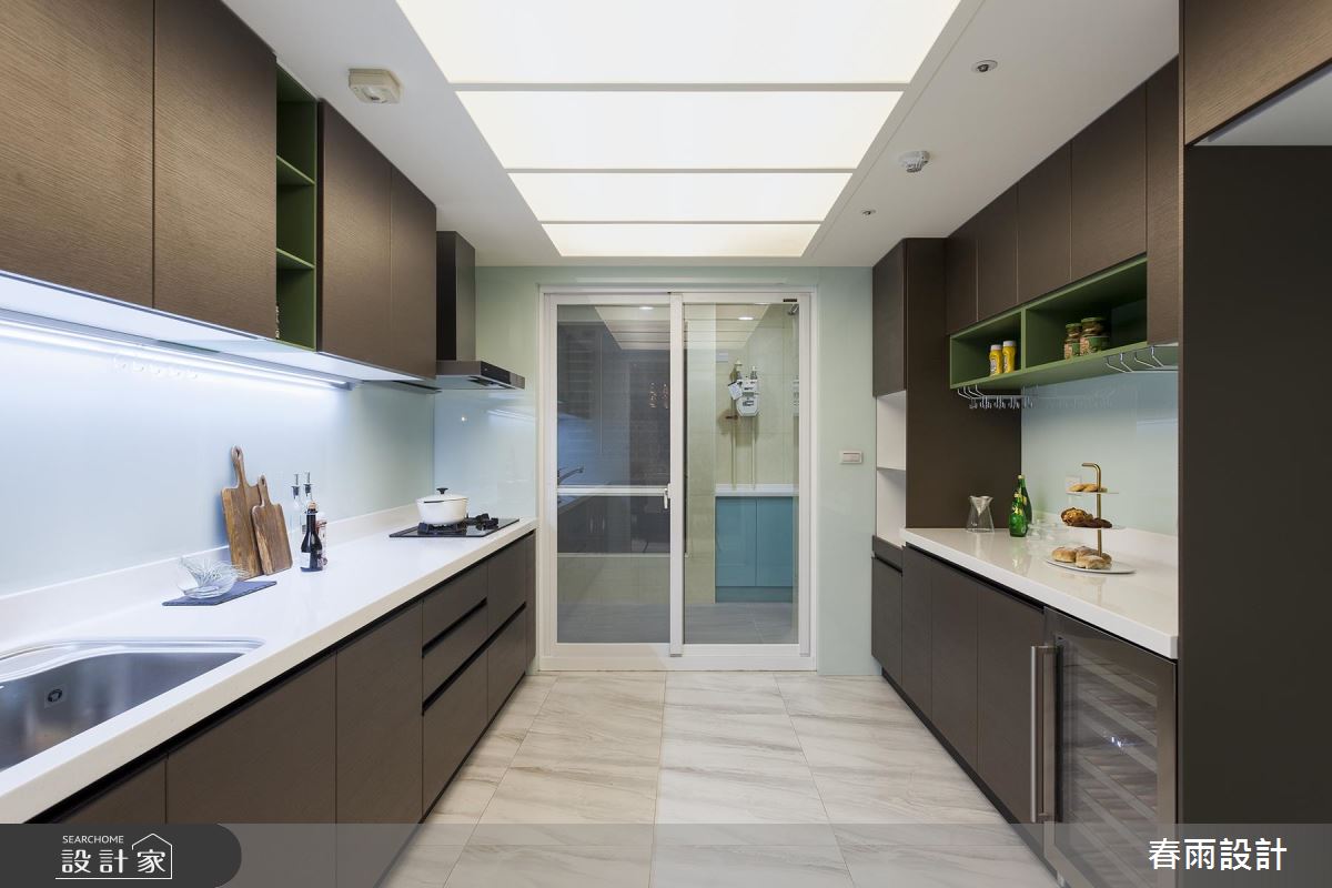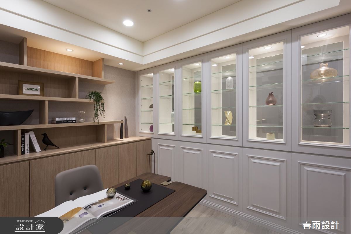半開放書房以收納櫃、桌面的木質調性,提升空間的溫暖氛圍。廚房採用雙排形式規劃廚具位置,同時留下較寬的走道通向後陽台。主臥透過床頭的紫色線板,定義空間主視覺,並以白色線板左右移動,遮擋黑玻門片的收納櫃,維持一定隱私。次臥在曲面天花下,規劃相機展示櫃,打造特別的居家端景。
