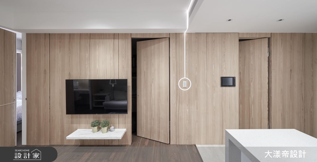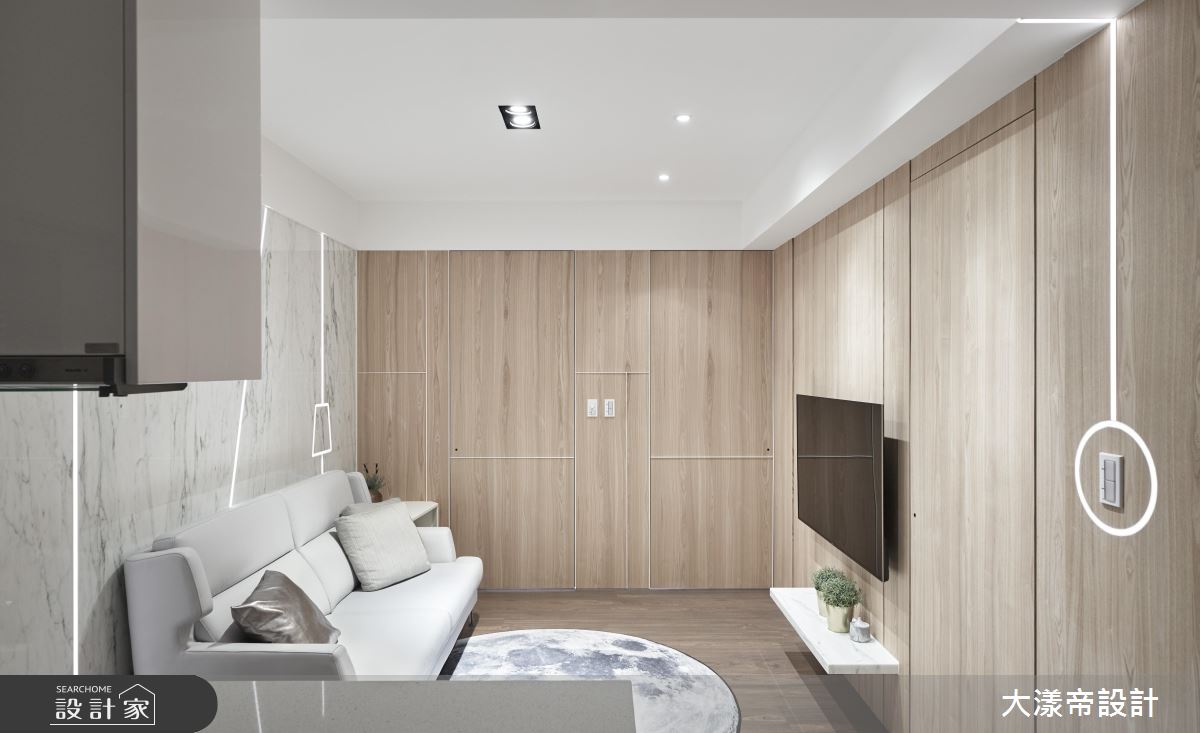 燈光開啟時,遊走整室的光束替 13 坪空間挹注聖光般意象,完美傳遞「上帝之手」的設計主軸。風格上以現代風襯托,並重塑格局打造完備機能,提供 4 人舒適的共享生活。