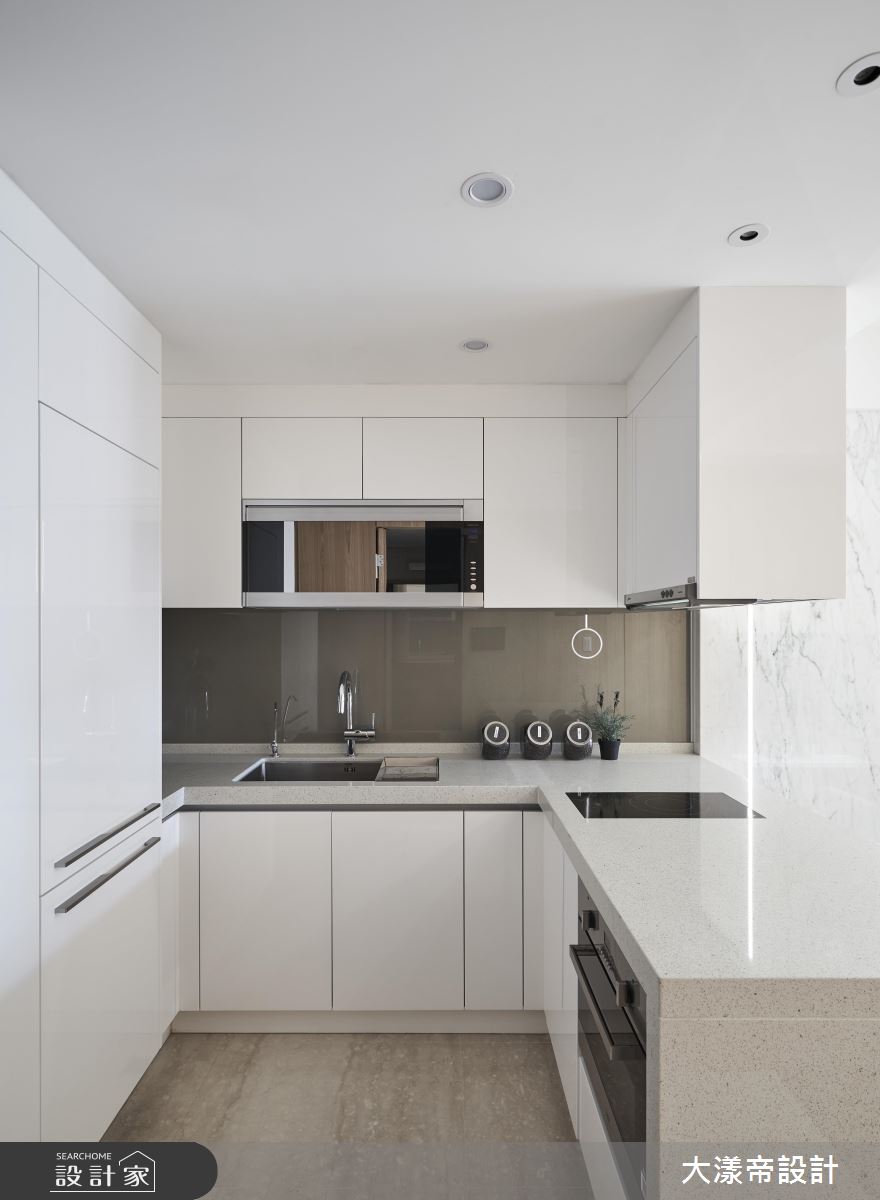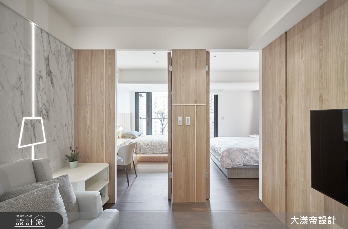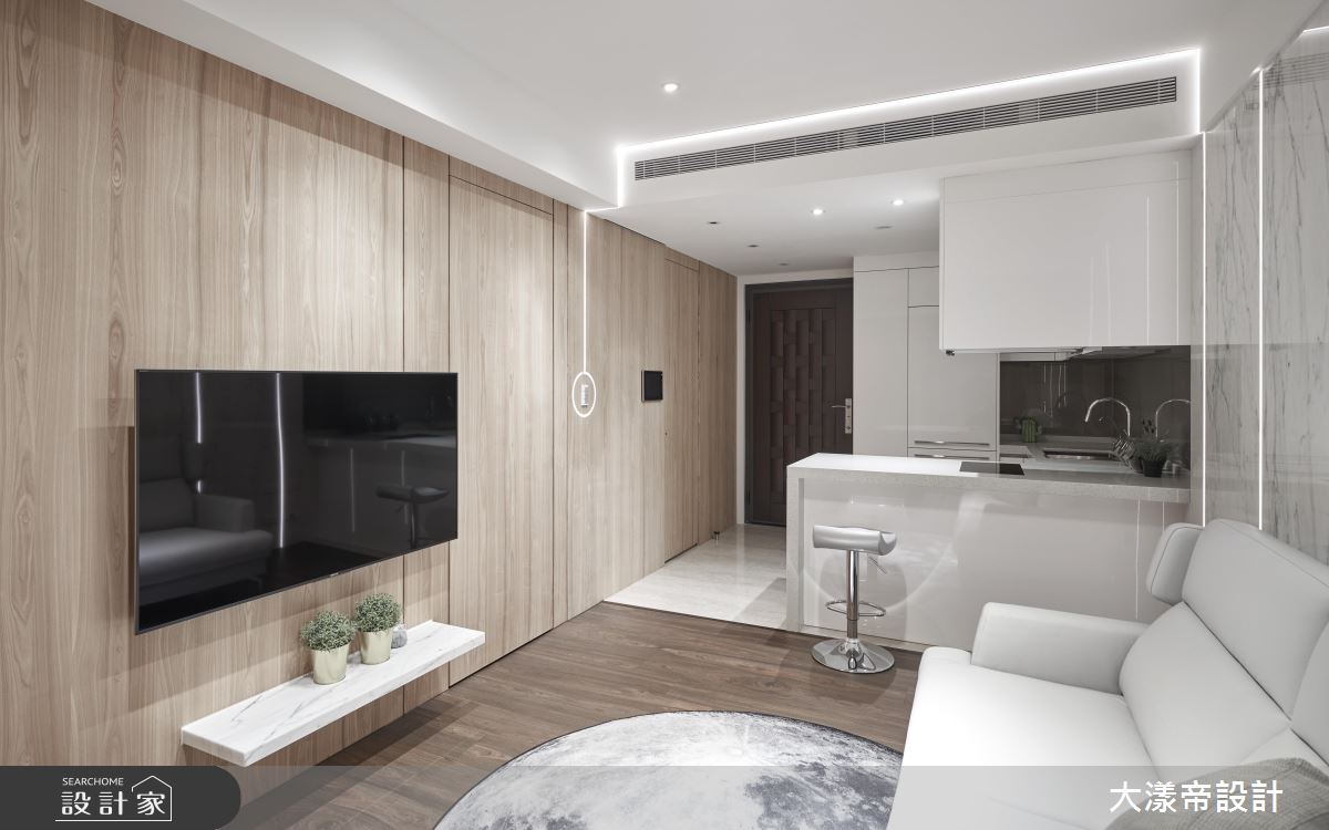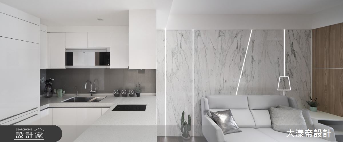 如何在 13 坪空間規劃客、餐廳、主臥外,還打造客臥、書房及更衣室,為此案設計重點!入室後,首先迎接ㄇ字型的餐廚空間,設備及風格簡練,以保留客廳場域的寬敞,中島吧檯作為客餐之間的中樞地帶,串起兩個區域的交流,並透過深色木皮地坪分野場域;來到客廳區,沙發背牆以浪漫帶點奢華的整面大理石轉換風格,再讓光束從電視牆一路延伸至大理石,映襯出空間的明亮及新穎設計,也為冷調石材注入些溫度。主臥、客臥、書房、浴室的牆面及門片,採以同色系木質隱身於公共空間的立面,化解門片過多的視覺感,再透過切割設計配合垂直的燈光裝飾,連貫立面整體性。