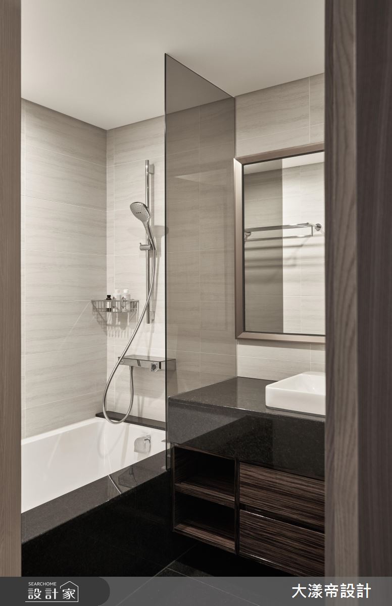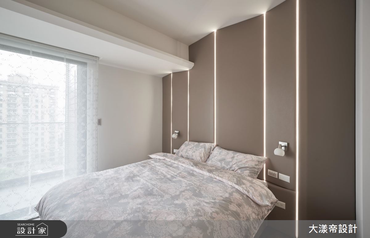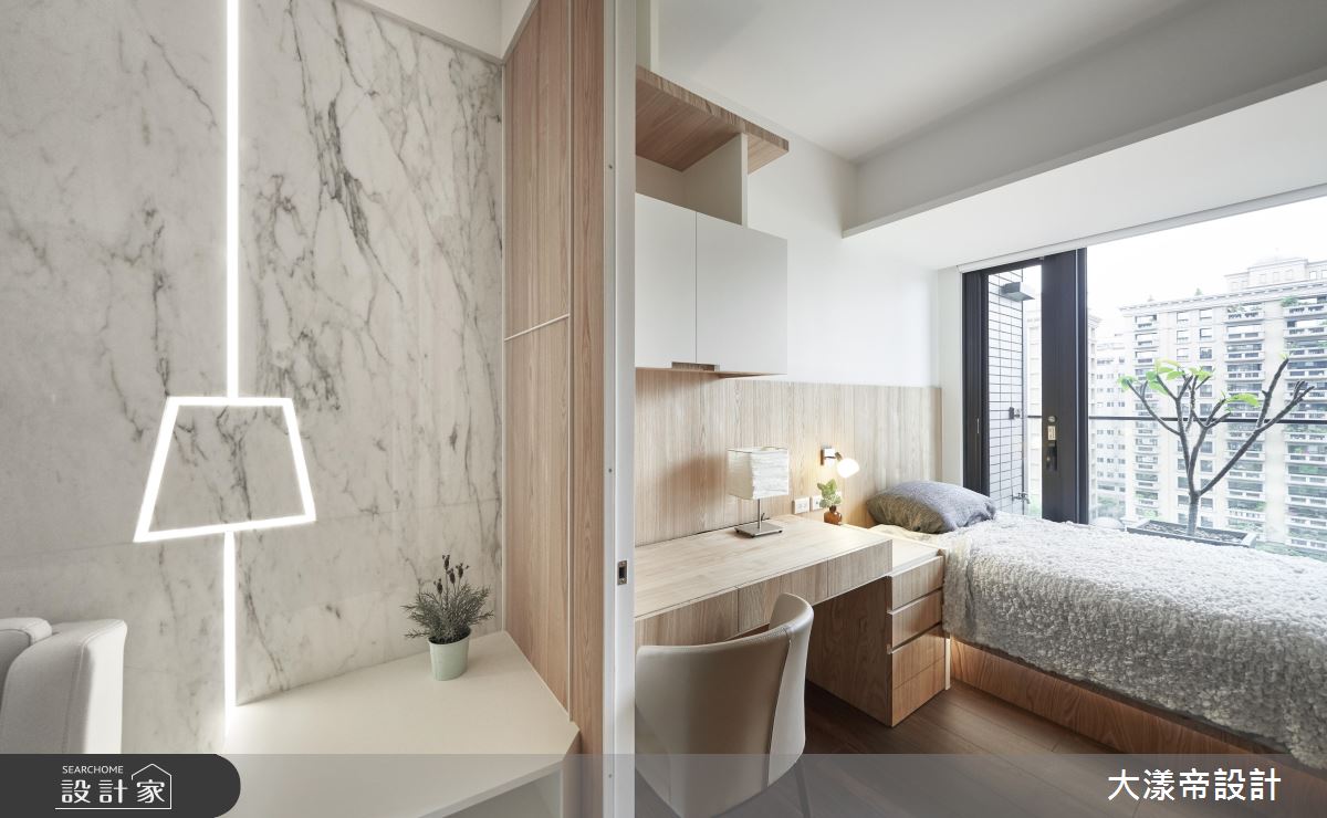 主臥同樣以光為裝飾主角,床頭背板巧思崁入垂直狀光束,溝縫處微微透出的光影反而凸顯了光的視覺強度,而略為傾斜的造型柔化樑線的位置,一同加乘設計感。設計師克服重重難關,從開關的圓型框線光、大理石牆帶有折射意象的光束、主臥床頭背板的崁燈,顛覆居家打燈的營造手法,以滿足 1 家 4 口的夢幻生活樣貌。