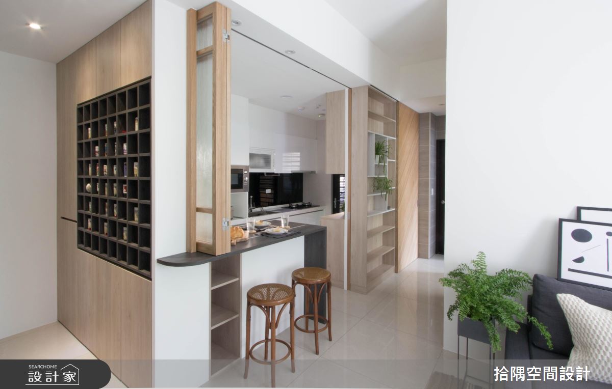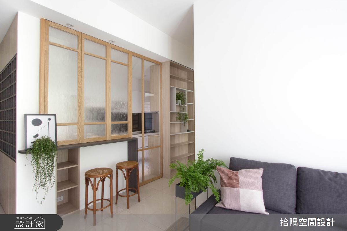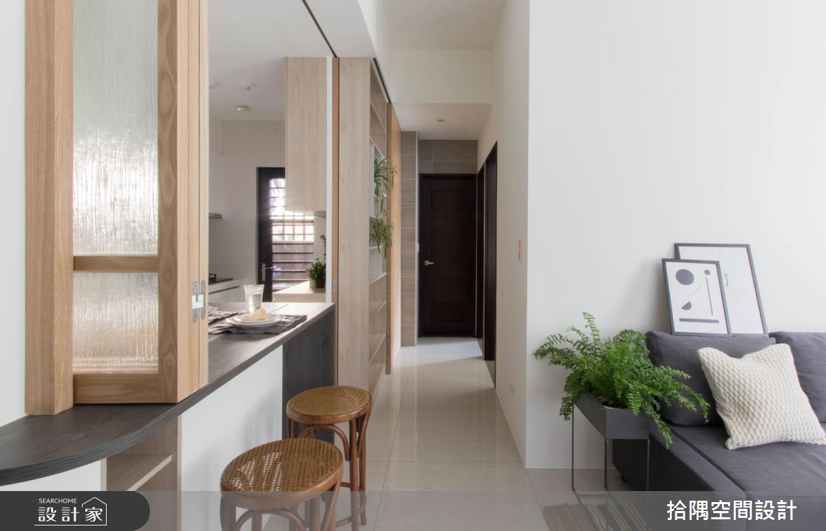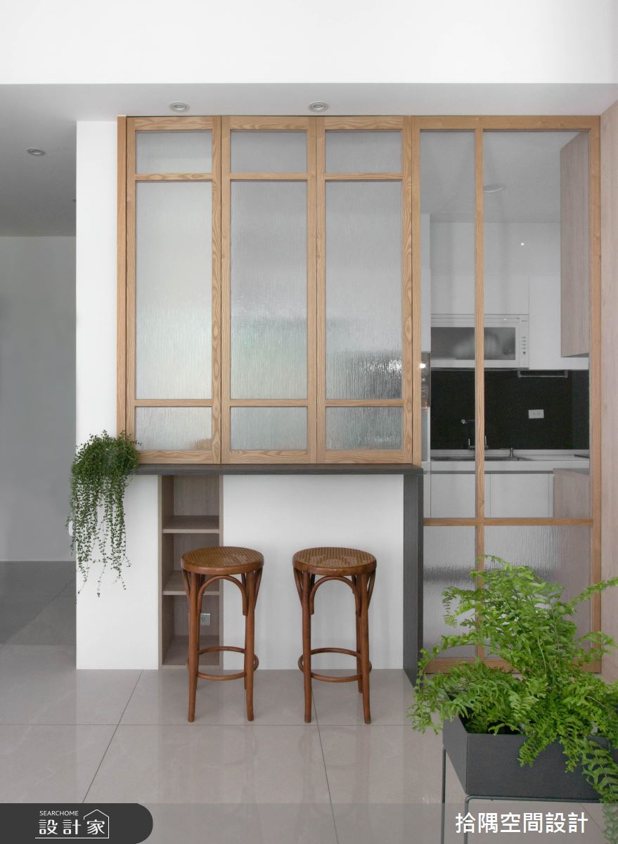 整體室內以大量的白色調飾底,敞朗日光從落地窗走進室內,照亮空間的純淨特質。玄關入室後,鞋櫃串連收納櫃,並以深淺色調的木紋交織出視覺層次,書籍與風格物件展示在其中,醞釀人文美學的美好;客廳裡僅透過灰色調的沙發擺設定調出空間主軸,一旁做為餐廚空間,則在中島上方利用木作與玻璃結合的拉門,界定出領域,可隨著屋主的需求敞開或關閉門扇,此設計讓餐廚機能相容,完成料理後,只要轉身就能將餐點放在中島上,讓家人盡情享用;餐廚空間的拉門引用透亮玻璃材質,讓公領域的光源也能走進烹飪領域,提高視覺的明亮度。