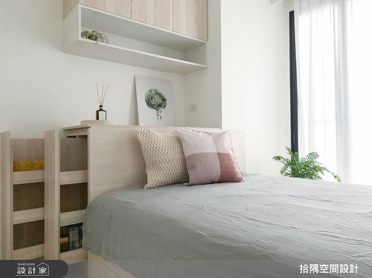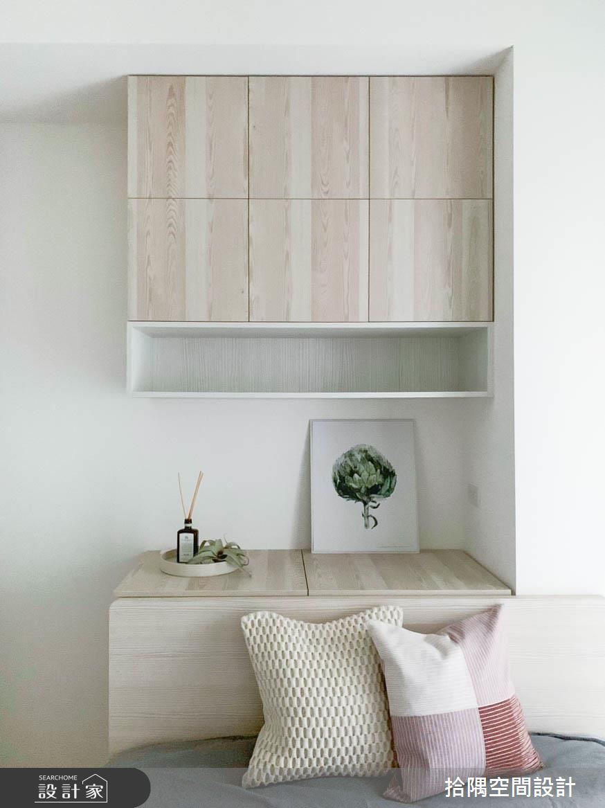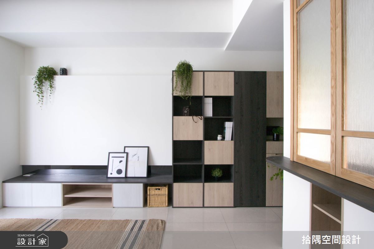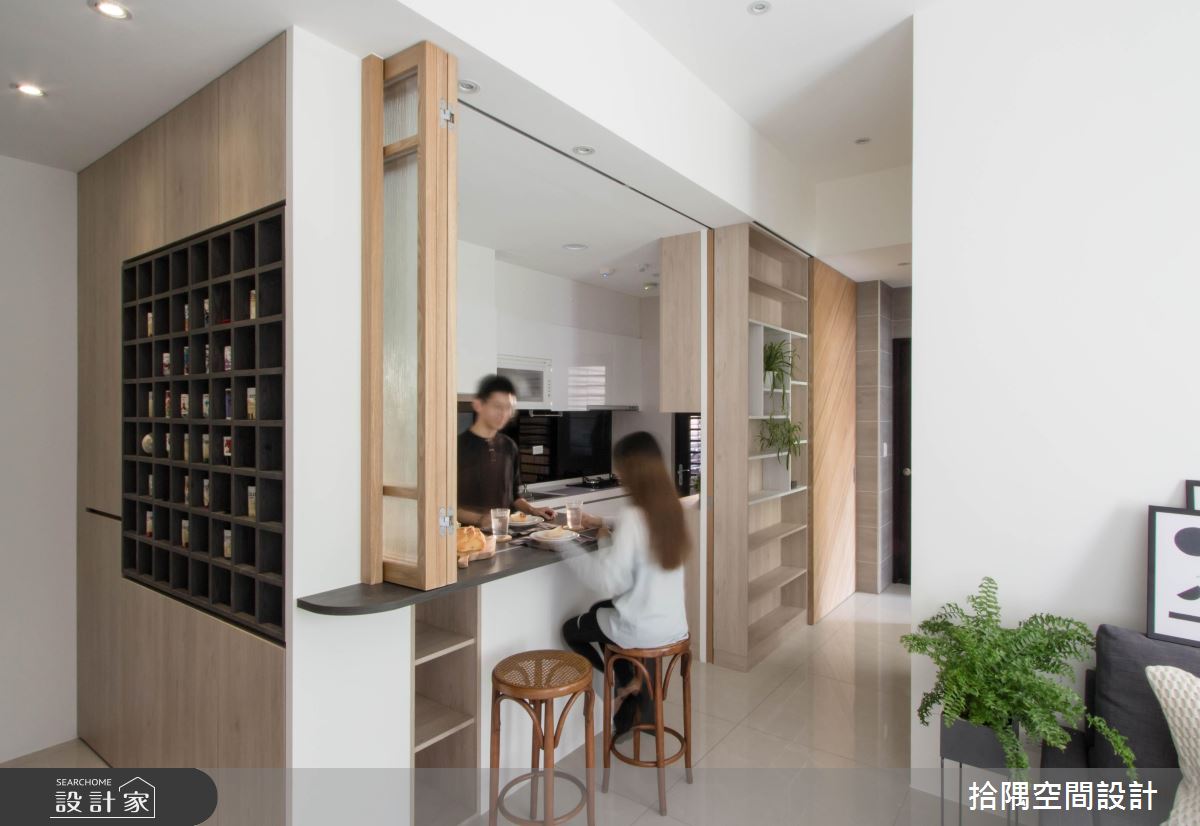 整體室內以大量的白色調飾底,敞朗日光從落地窗走進室內,照亮空間的純淨特質。玄關入室後,鞋櫃串連收納櫃,並以深淺色調的木紋交織出視覺層次,書籍與風格物件展示在其中,醞釀人文美學的美好;客廳裡僅透過灰色調的沙發擺設定調出空間主軸,一旁做為餐廚空間,則在中島上方利用木作與玻璃結合的拉門,界定出領域,可隨著屋主的需求敞開或關閉門扇,此設計讓餐廚機能相容,完成料理後,只要轉身就能將餐點放在中島上,讓家人盡情享用;餐廚空間的拉門引用透亮玻璃材質,讓公領域的光源也能走進烹飪領域,提高視覺的明亮度。